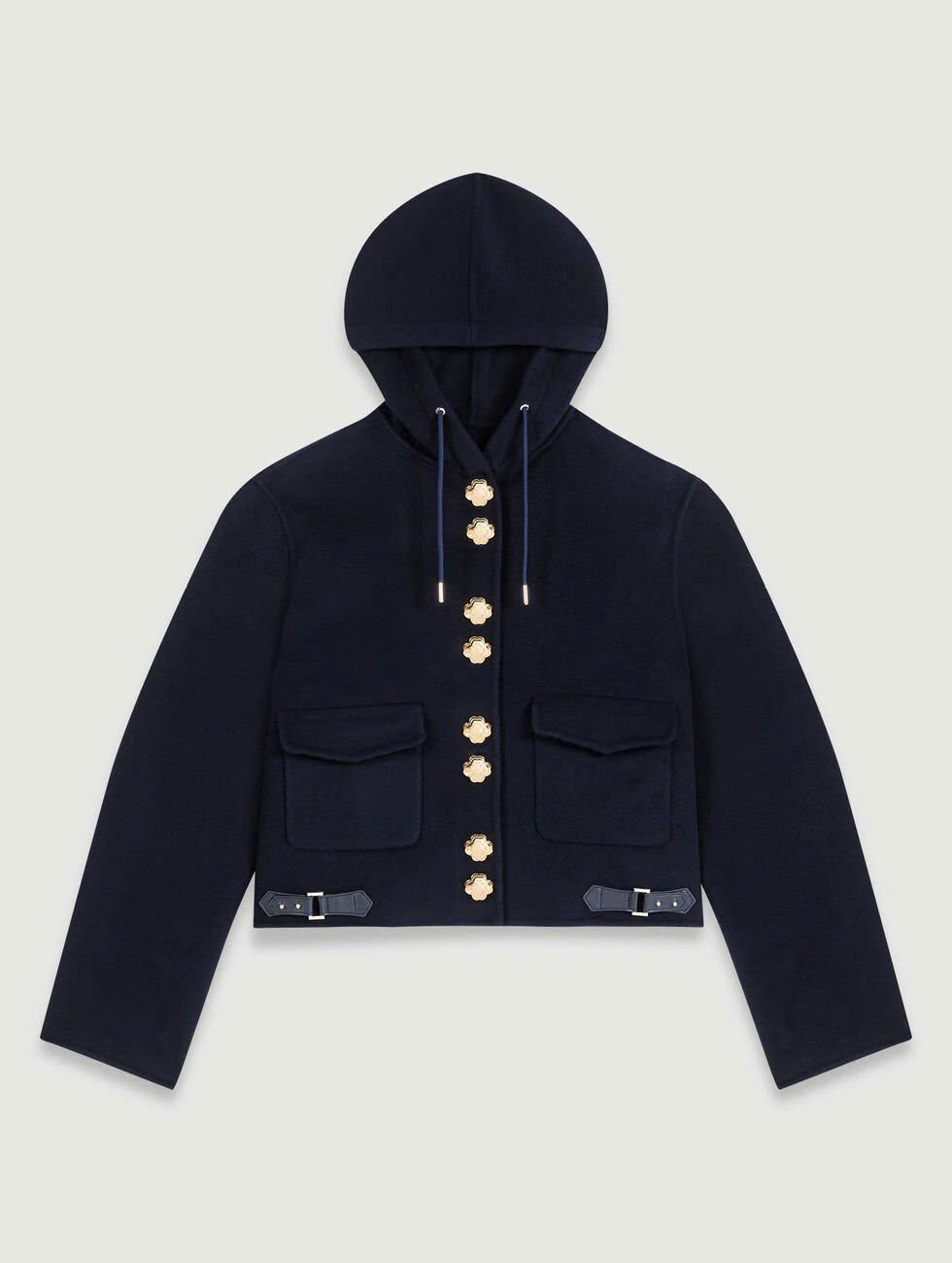 Áo khoác ngắn hai mặt Mũ trùm đầu có dây rút Nút cài đặt Gold Clover 2 túi có nắp Ứng dụng miếng đệm có thể điều chỉnh Nút cỏ ba lá vàng Vải chính: 81% len, 19% polyamit