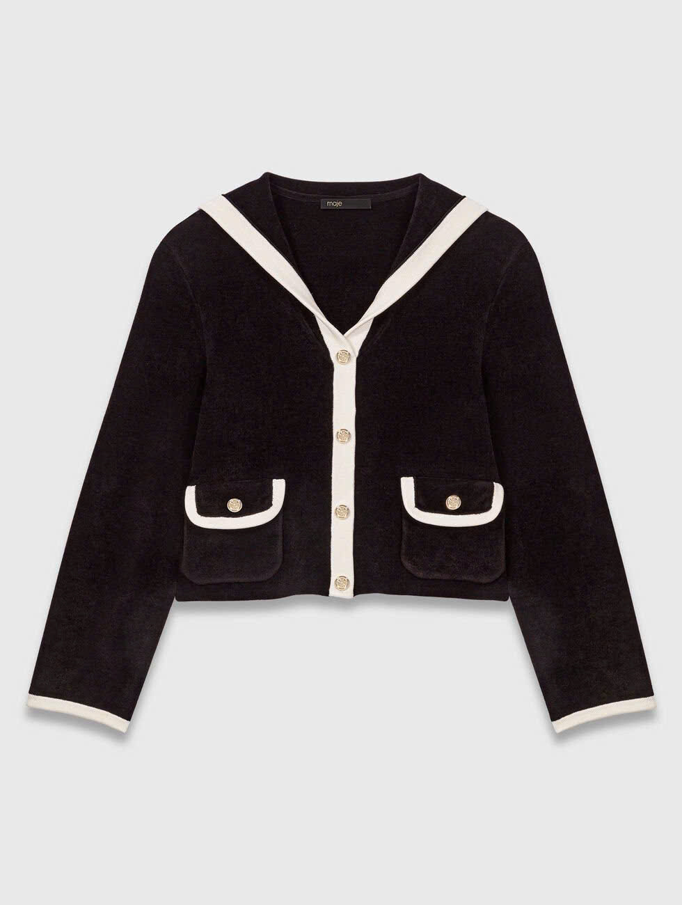 Áo len cardigan dệt kim hiệu ứng nhung cắt ngắn có viền tương phản Cổ áo thủy thủ và tay dài Cài nút