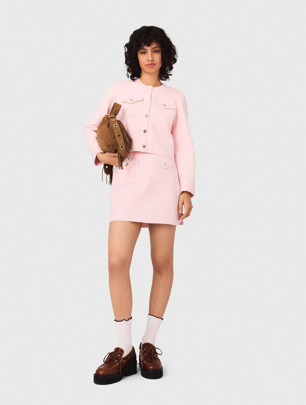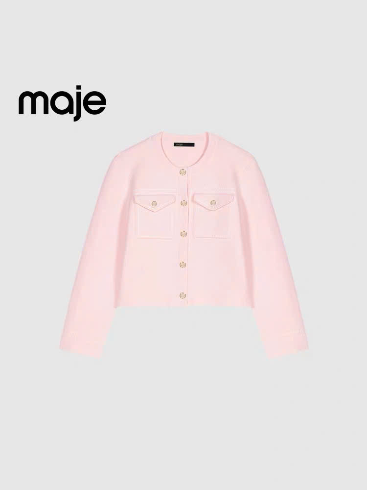 •Áo khoác len ngắn với đường chỉ may tương phản •Cổ tròn, tay dài •2 túi vá có nắp ở ngực •Khuy bấm trang trí