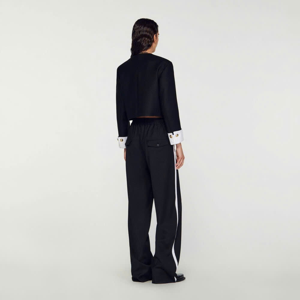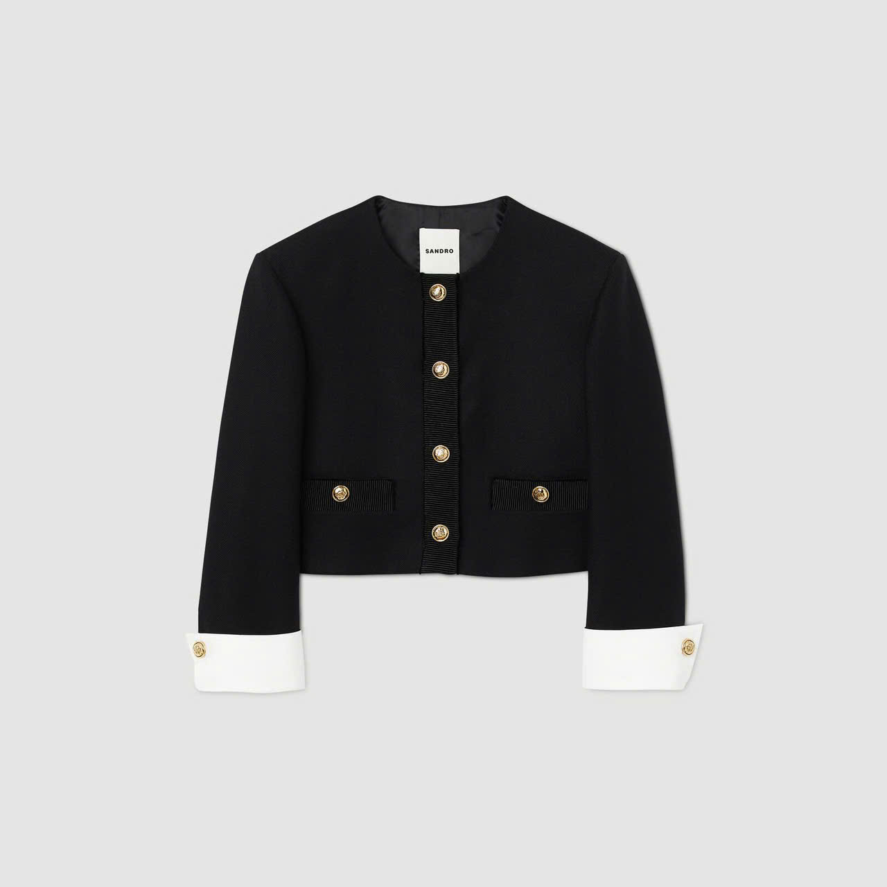 Áo khoác ngắn, có cấu trúc làm từ vải len dệt chéo, tay dài, cổ tay áo có thể tháo rời màu tương phản, cài khuy bằng khuy trang trí và được tô điểm bằng họa tiết sọc.