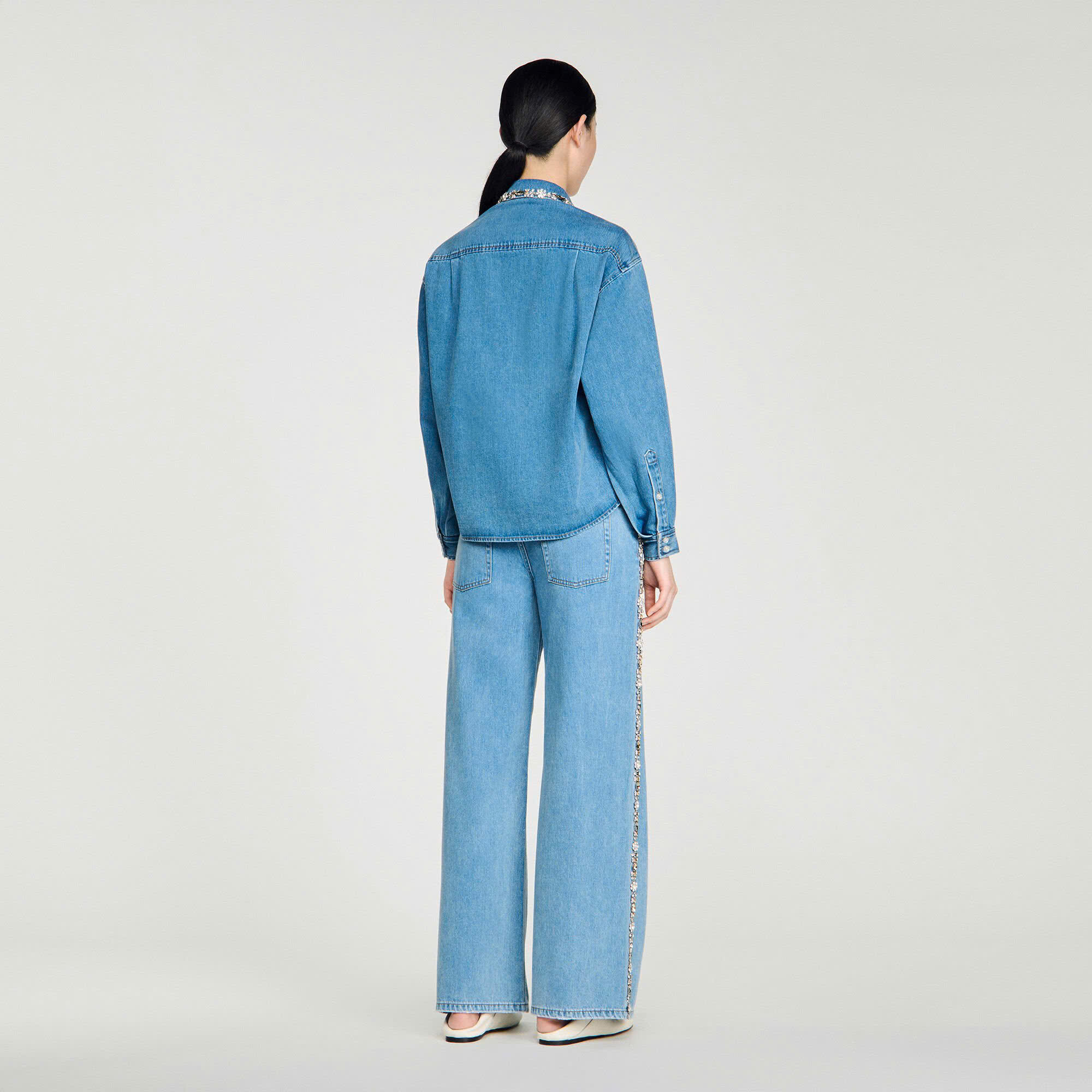 Áo sơ mi denim đính đá lấp lánh, cổ áo sơ mi, tay dài và cài nút.