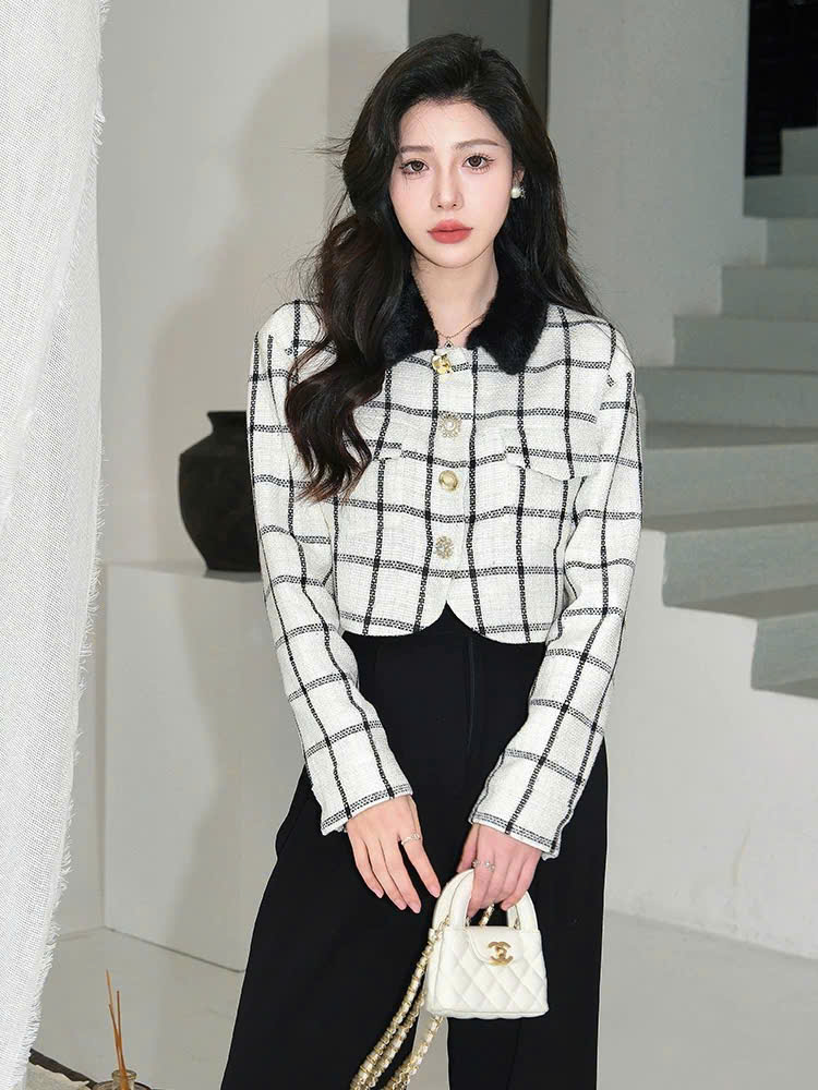 Áo khoác Sel-Portrait kẻ caro cổ lông