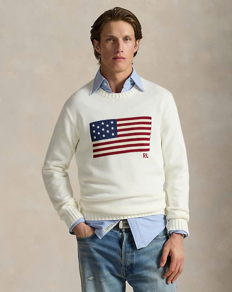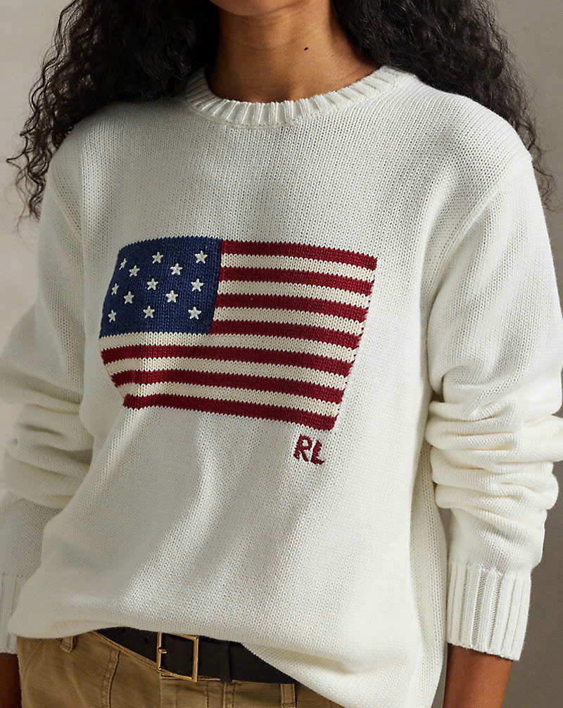 Hình lá cờ Mỹ lịch sử được dệt kim intarsia ở giữa phía trước. Thêu ngôi sao và chữ "RL" ở phía trước.