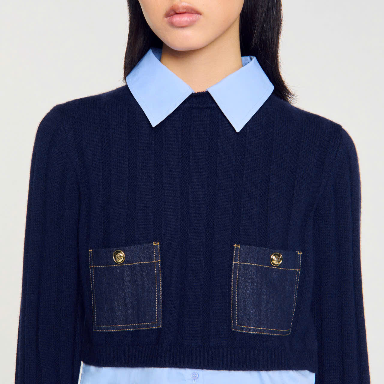 MÔ TẢ Áo len dệt kim len cashmere cắt cúp, có vạt áo, tay dài và túi vá bằng vải denim.