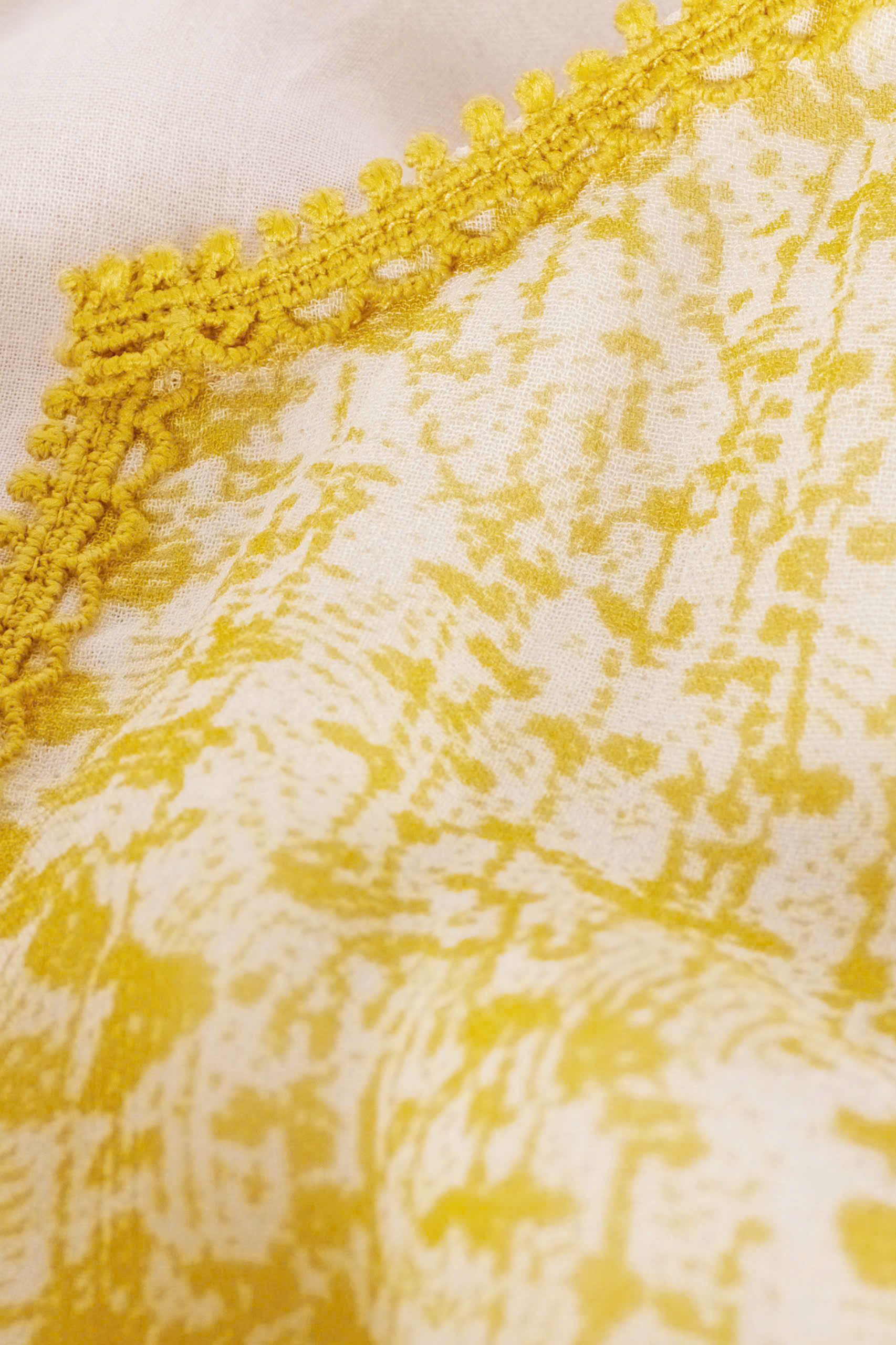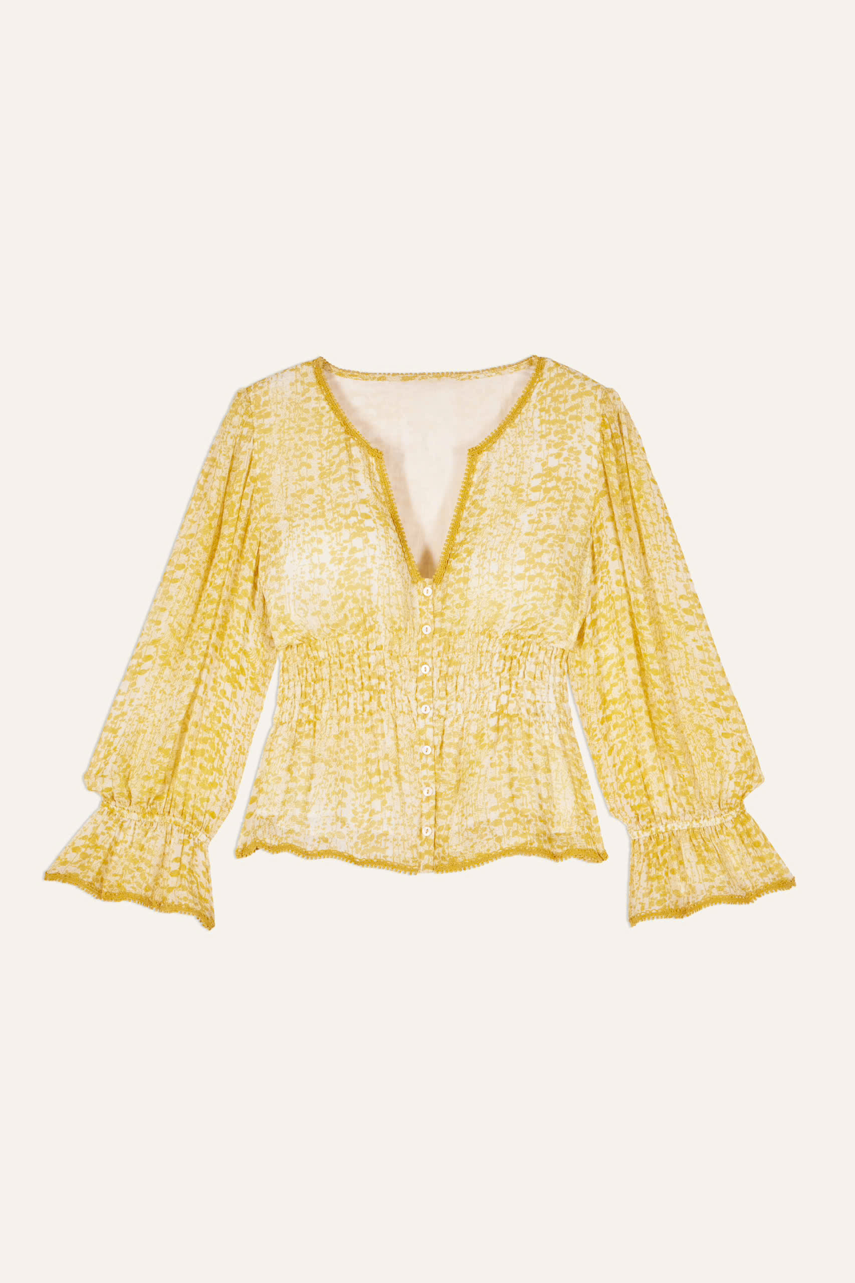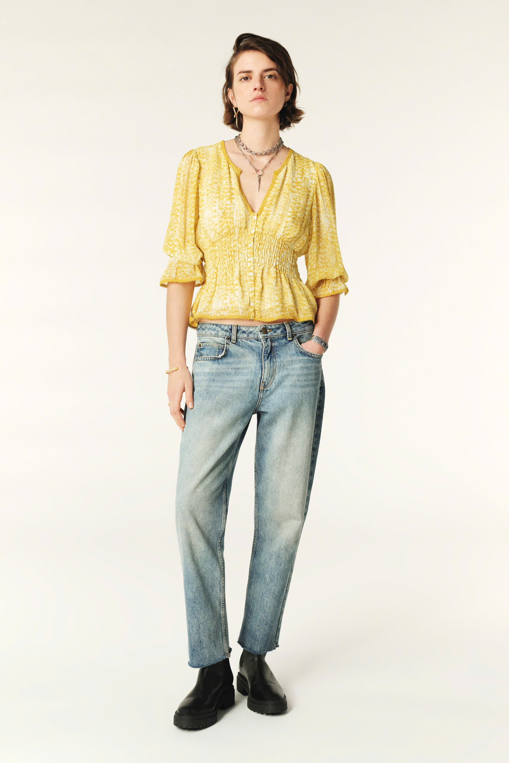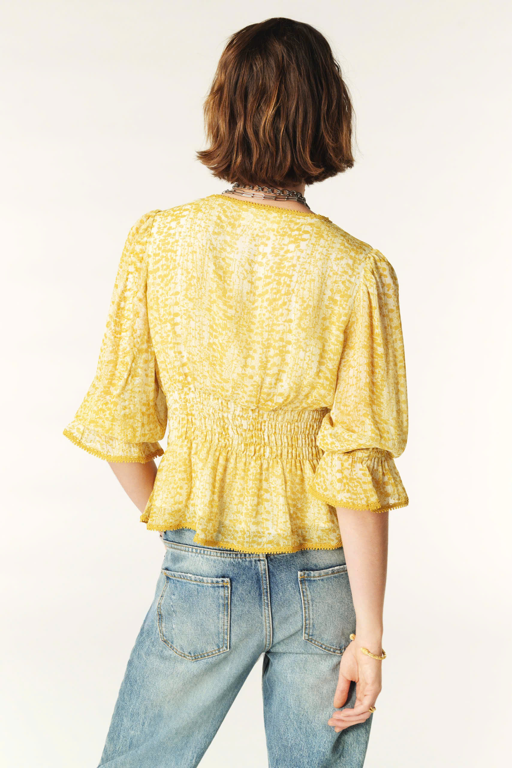 Chất liệu: silk - Áo - Tay bồng - Cổ chữ V - Cài nút - Chi tiết bèo nhún
