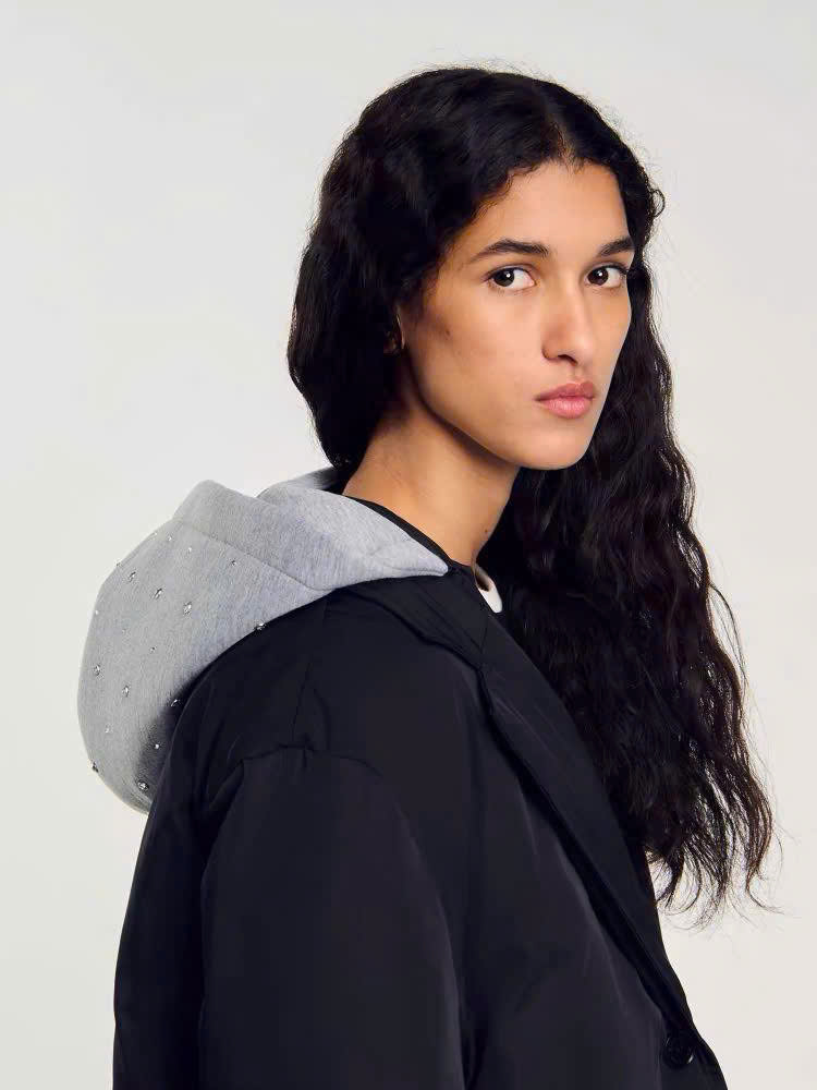 Áo khoác len Sandro dệt kim 2 hàng khuy viền trắng cổ tròn
