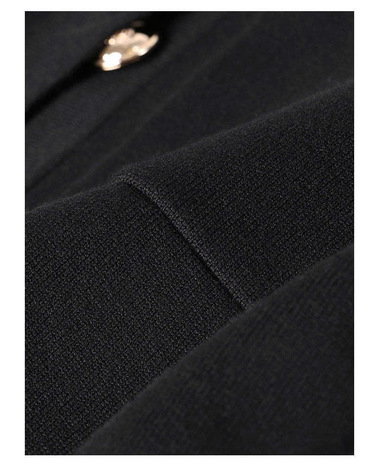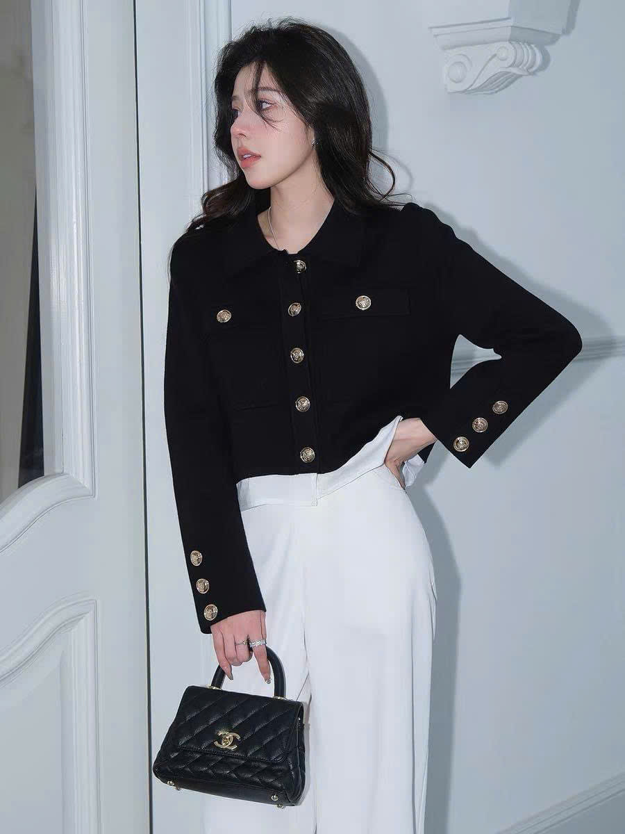 Màu sắc: Màu đen chủ đạo, điểm nhấn bằng hàng khuy kim loại màu vàng sang trọng