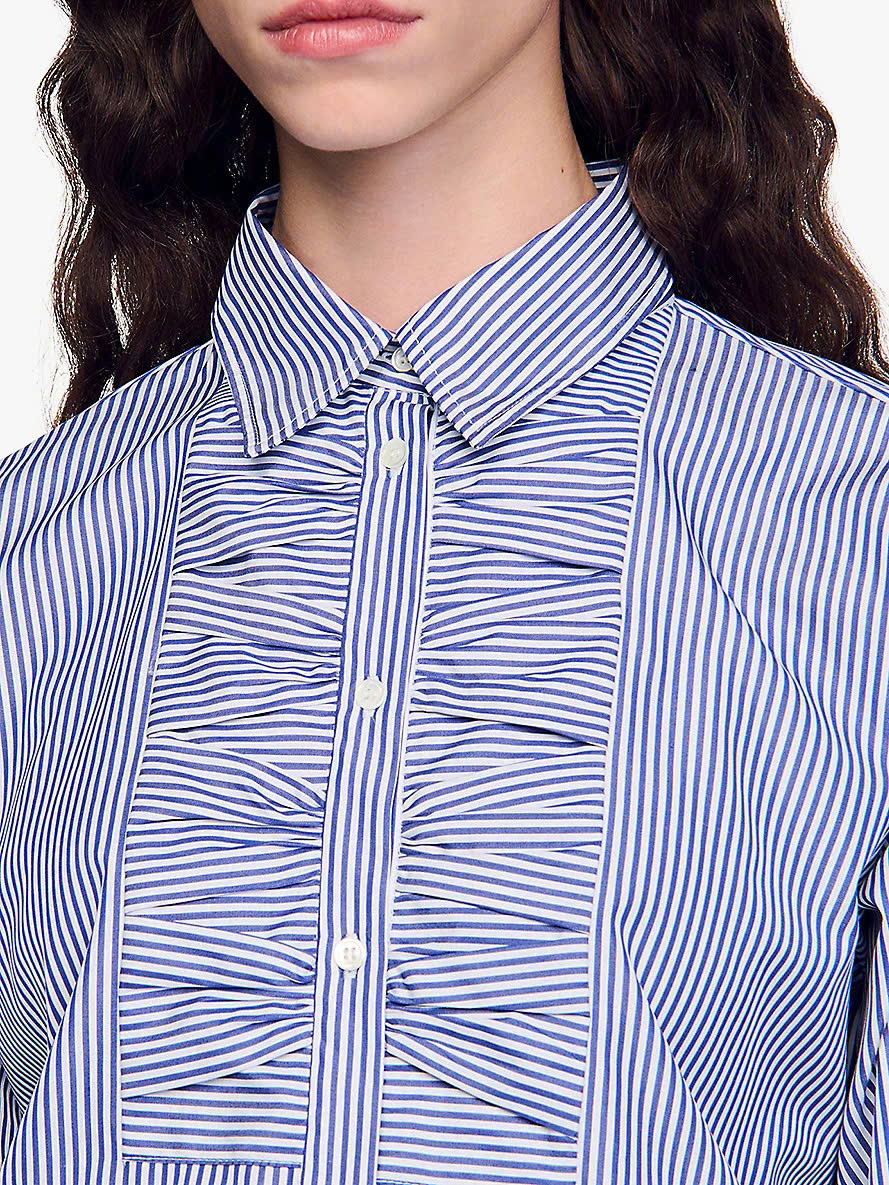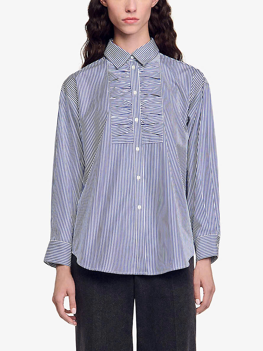 Chất liệu: 100% cotton - Cài nút lộ phía trước - Cổ áo thẳng - Dáng rộng, cổ áo, tay dài, cài nút ở cổ tay áo, gấu áo cong, viền bèo nhún phía trước, họa tiết sọc toàn bộ