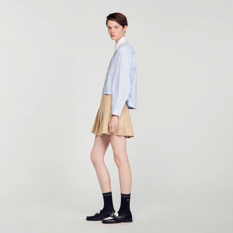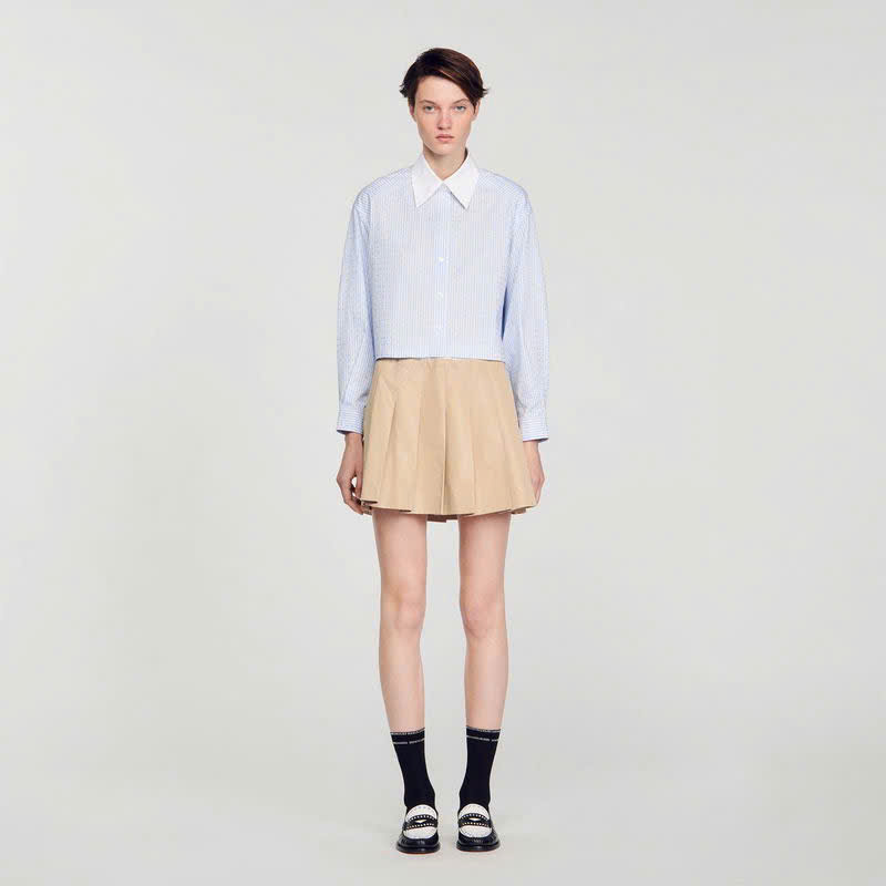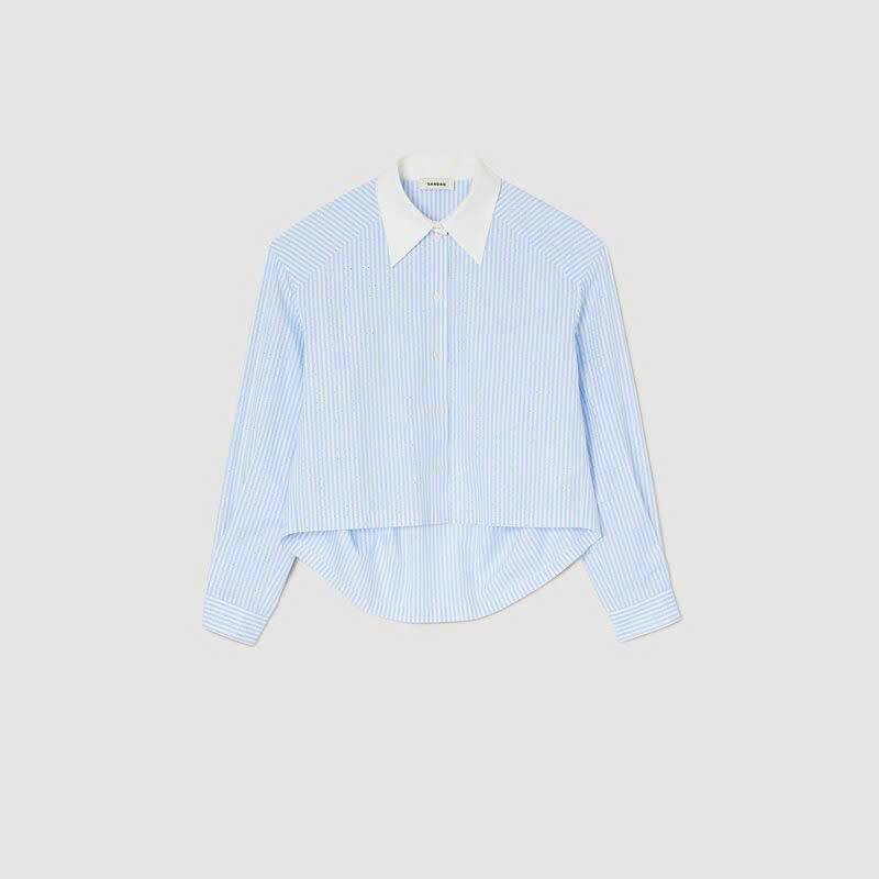 Áo sơ mi tay ngắn có cổ áo tương phản và tay áo rộng, được trang trí bằng họa tiết sọc và đá pha lê khắp thân áo