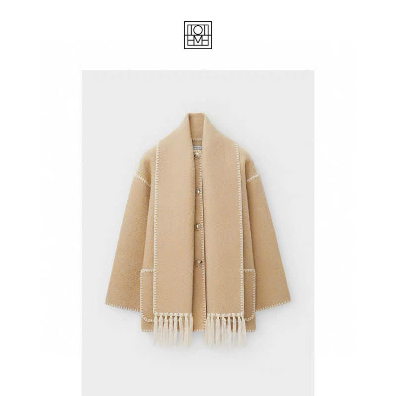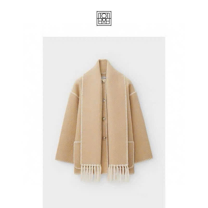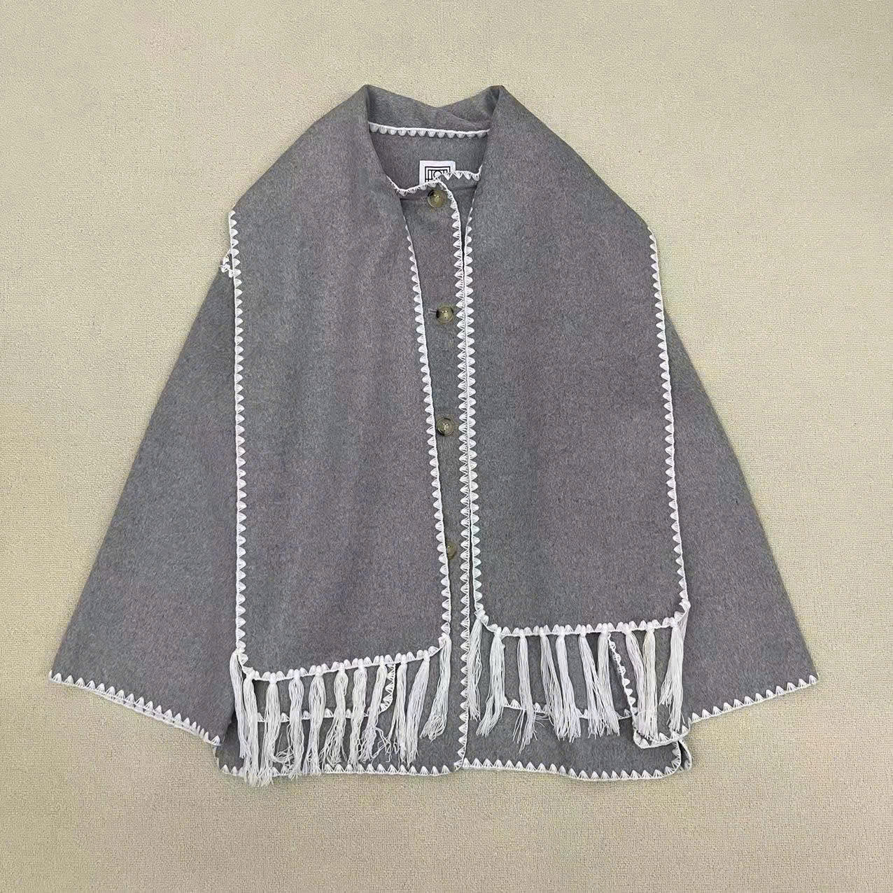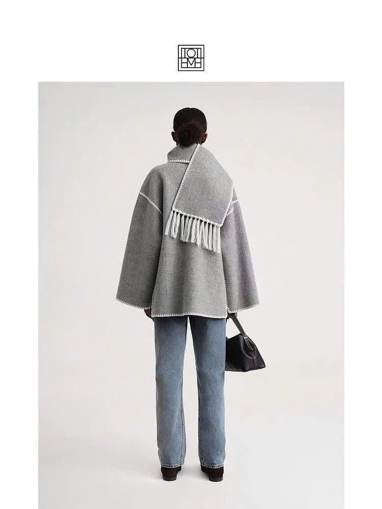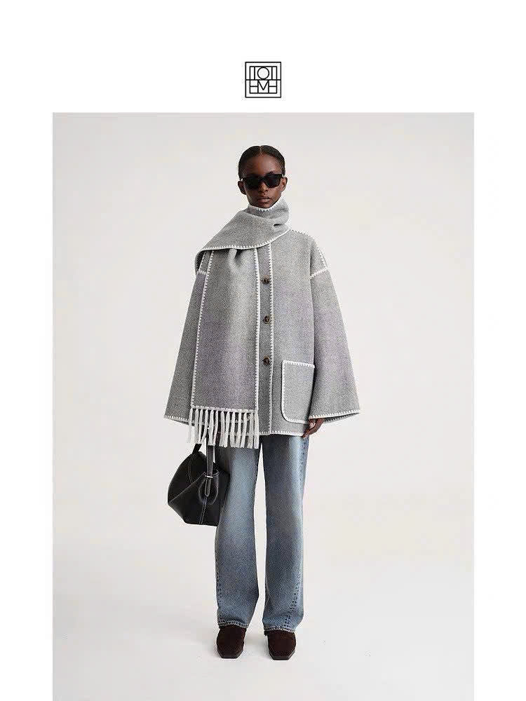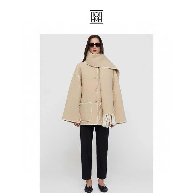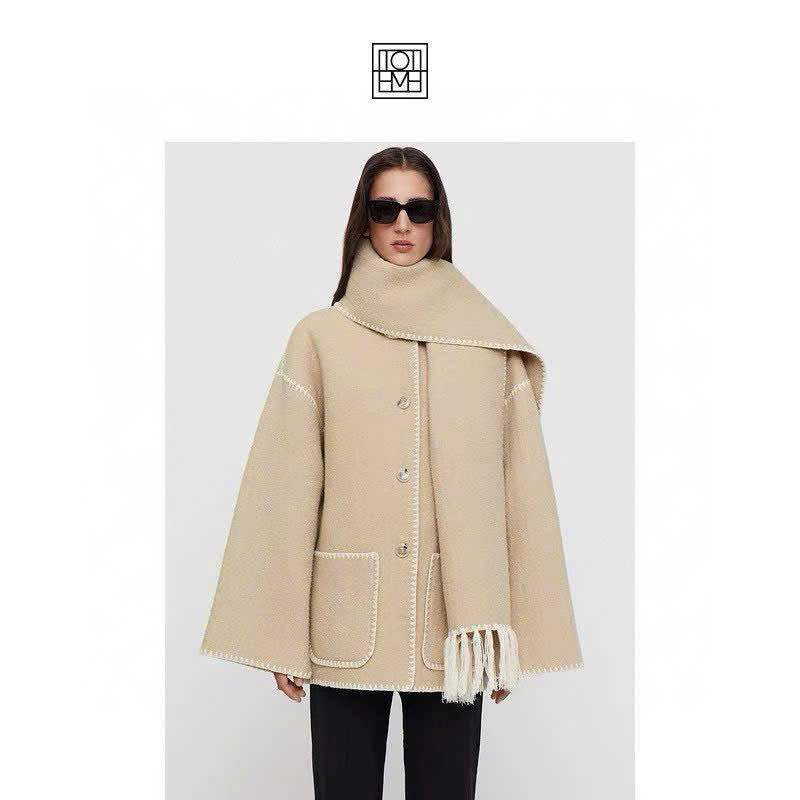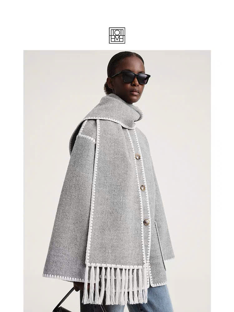 Cape dạ TOTEME choàng kèm khăn viền trắng tua rua