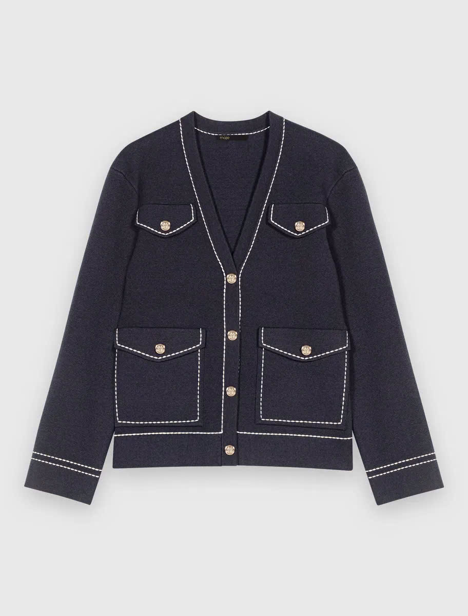 •Áo cardigan dệt kim sợi dọc dài •Đường chỉ khâu yên ngựa tương phản •Khuy bấm hình cỏ ba lá •Bốn túi nắp