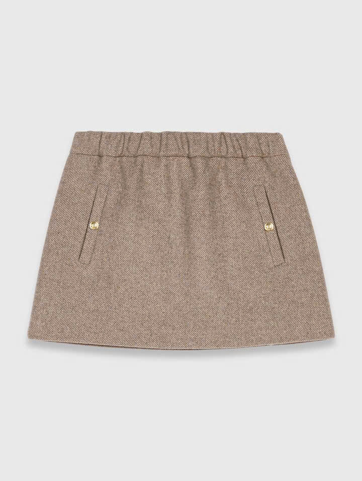 -Chân váy ngắn pha len -Cạp chun và túi có nắp -Khóa kéo bên hông