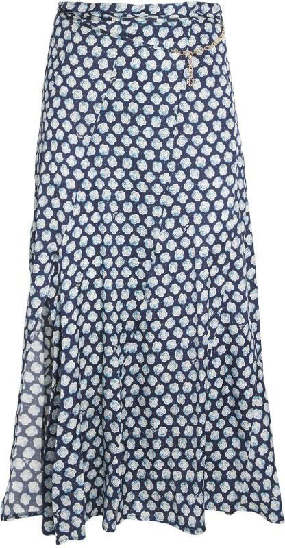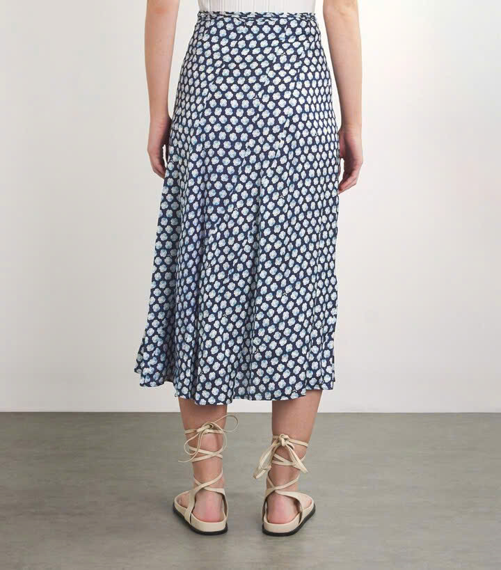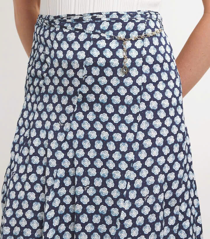 Chiếc váy là một mẫu váy midi xẻ trước với họa tiết chấm bi nhỏ, nền màu xanh đậm với các chấm màu trắng. Thiết kế có eo cao, hơi loe nhẹ từ đầu gối xuống tạo cảm giác mềm mại và nữ tính. Phần xẻ trước giúp tăng độ thoải mái khi di chuyển và tạo điểm nhấn tinh tế.