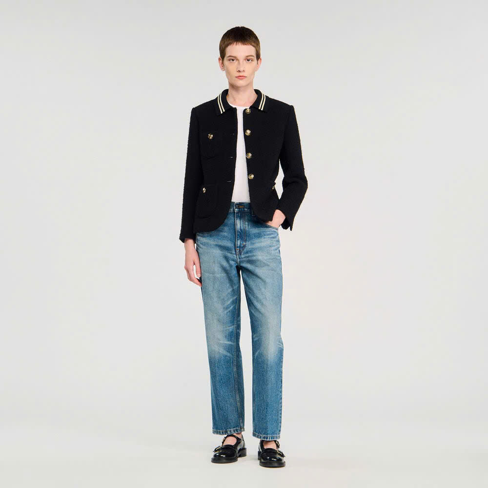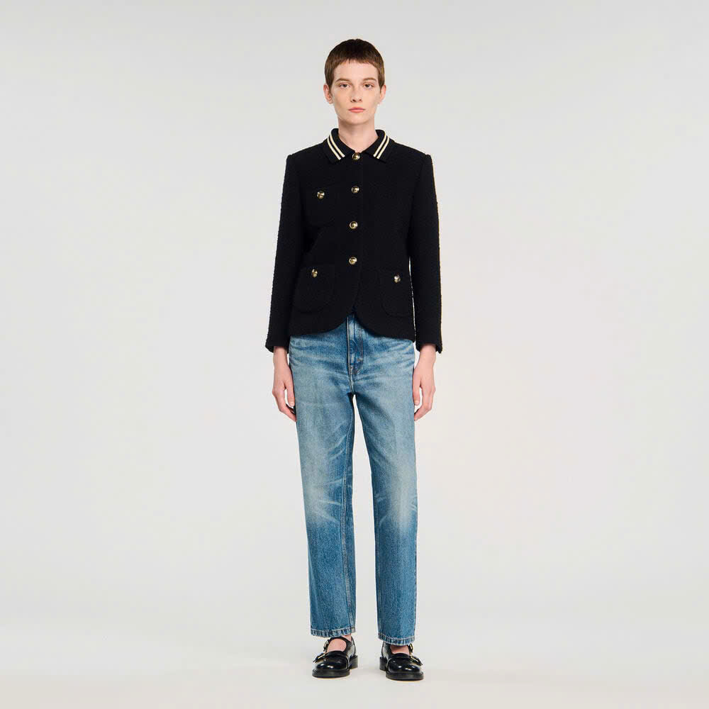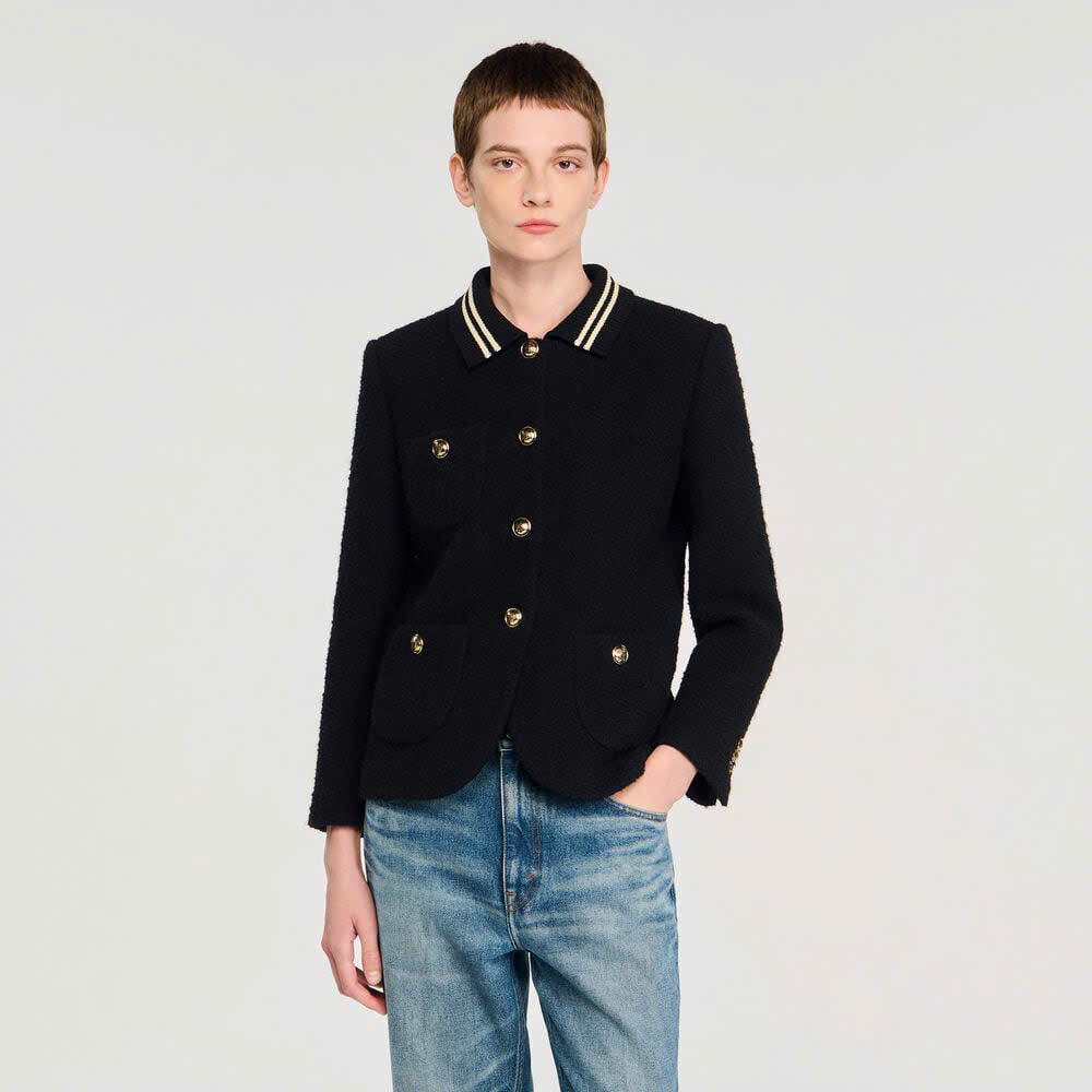 Áo khoác vải tuýt có cổ bẻ và viền tương phản, tay dài, cài nút phía trước và túi vá có nút.
