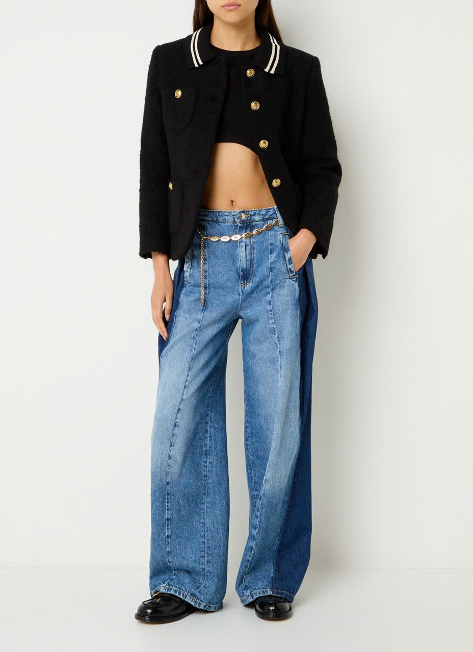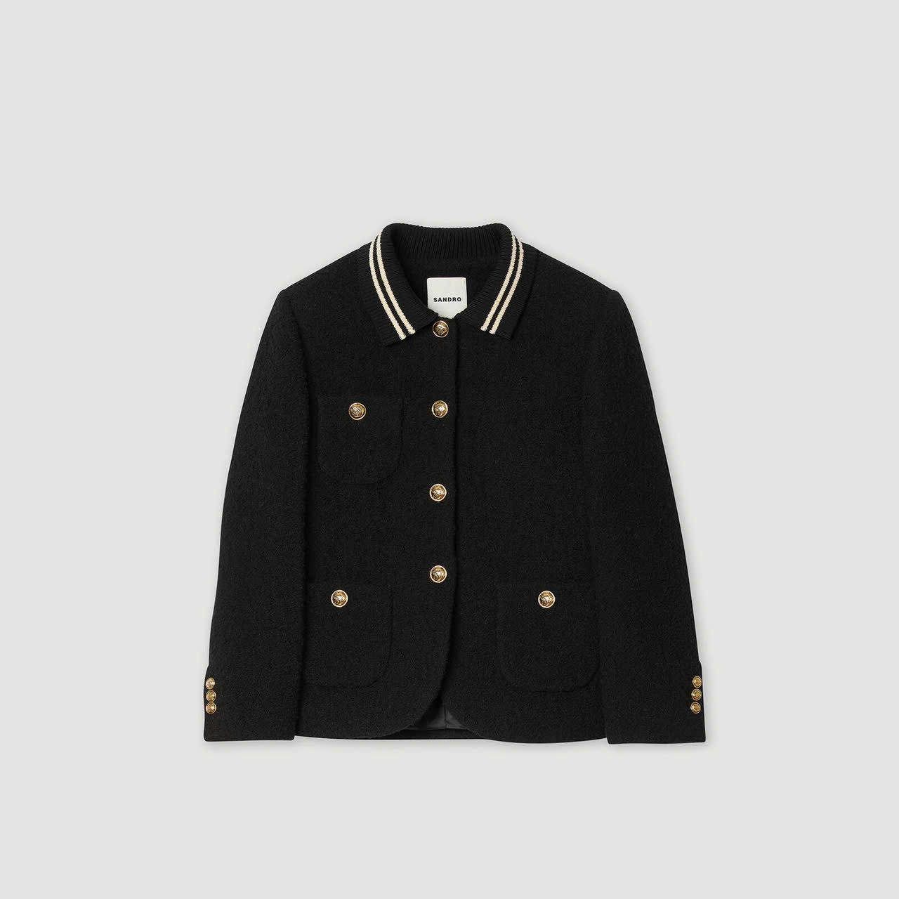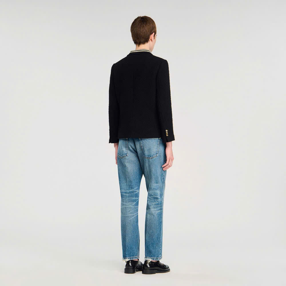 Áo khoác vải tuýt có cổ bẻ và viền tương phản, tay dài, cài nút phía trước và túi vá có nút.