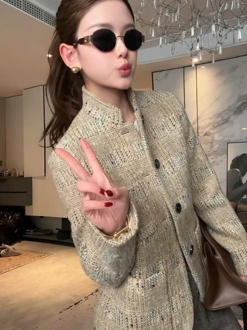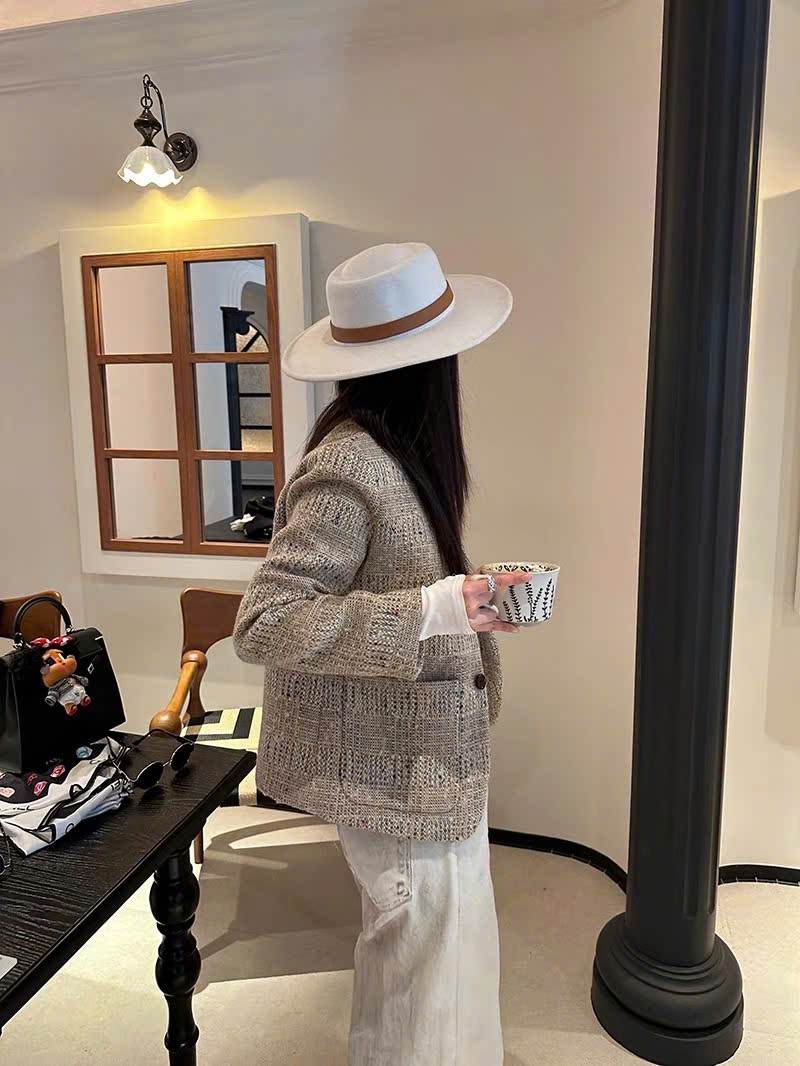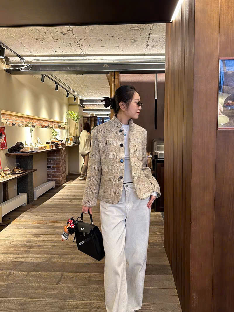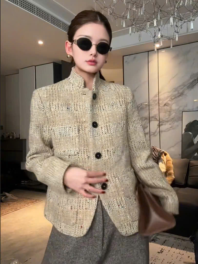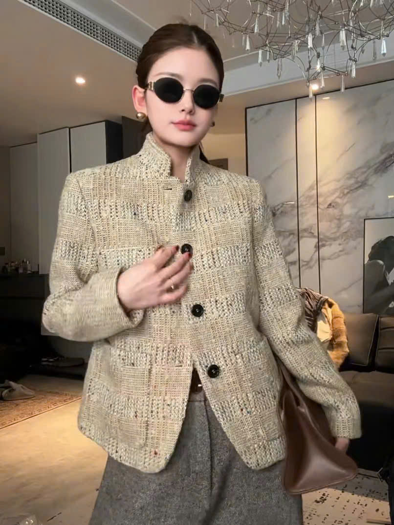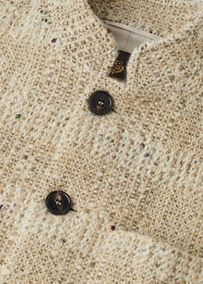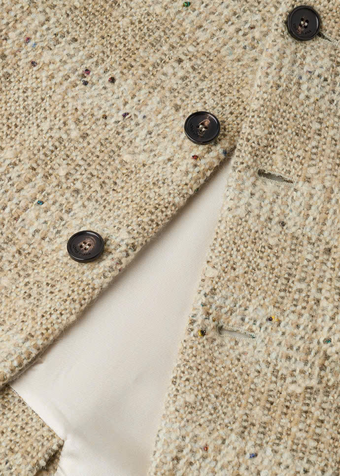 Cổ đứng ; túi vá; túi vé ; cài khuy một hàng; khuy sừng; xẻ tà một bên; lót lụa; dáng regular fit; chất liệu vải tweed . Thành phần: 80% len nguyên chất, 11% sợi microfiber, 6% viscose, 2% lanh, 1% cotton.