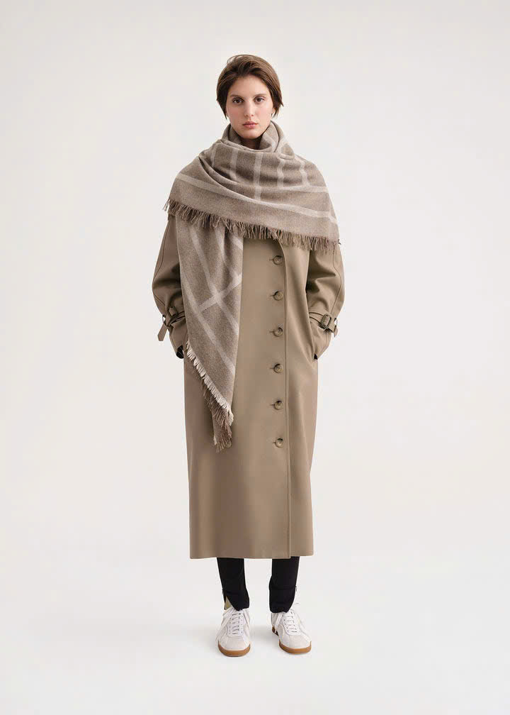 - Xám đậm - 88% Len, 12% Cashmere - Giặt khô - Vị trí họa tiết chữ lồng có thể khác so với hình ảnh Kích thước
