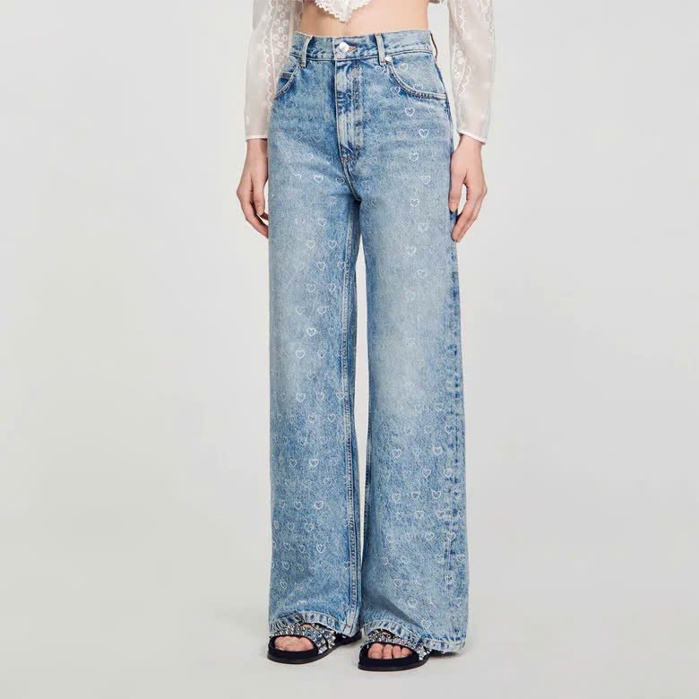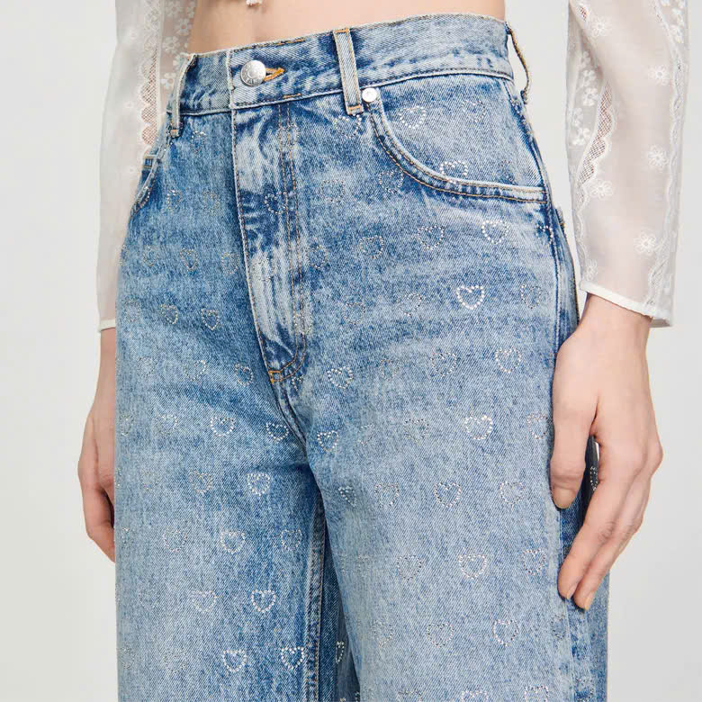 Quần jean denim ống rộng phai màu được tô điểm bằng những trái tim đính kim cương giả.