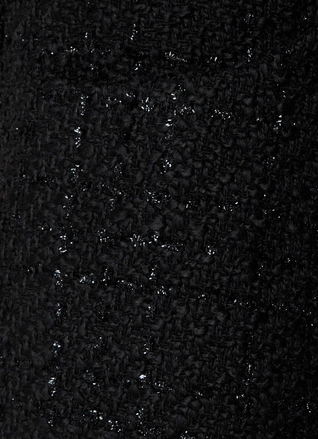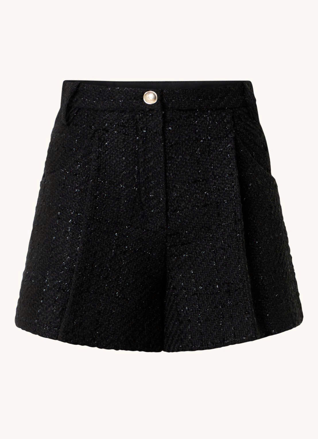 Quần short lưng cao, dáng suông nhẹ, có ly phía trước, tạo cảm giác thanh lịch và hiện đại. Cạp quần có đai để phối cùng thắt lưng nếu muốn. Có khuy cài kim loại phía trước, tăng điểm nhấn cho trang phục. • Chất liệu: Dường như là vải tweed hoặc vải dạ có pha sợi ánh kim/glitter, tạo hiệu ứng lấp lánh sang trọng dưới ánh sáng. Vải có độ đứng, giữ phom tốt, phù hợp cho cả đi chơi hoặc phối đồ dự tiệc. • Màu sắc: Màu đen ánh nhũ bạc hoặc ánh kim, mang lại cảm giác sang chảnh nhưng vẫn dễ phối đồ.