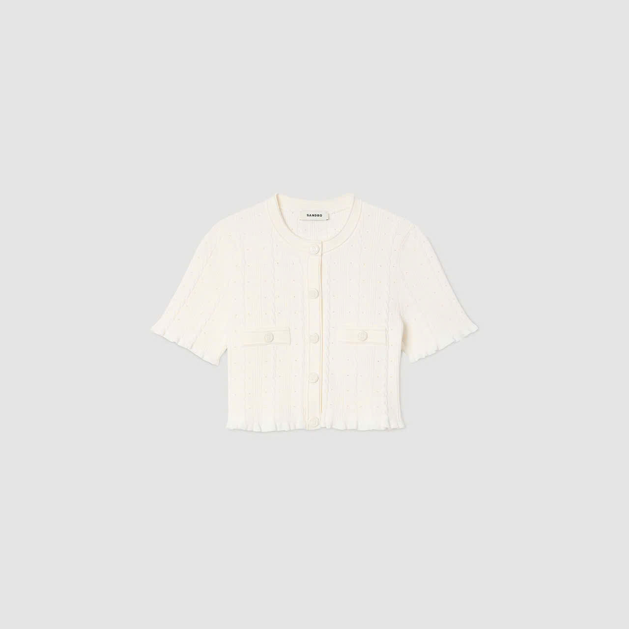 Áo cardigan đan mũi nhọn ngắn, cổ tròn, tay ngắn, cài nút và túi phía trước.