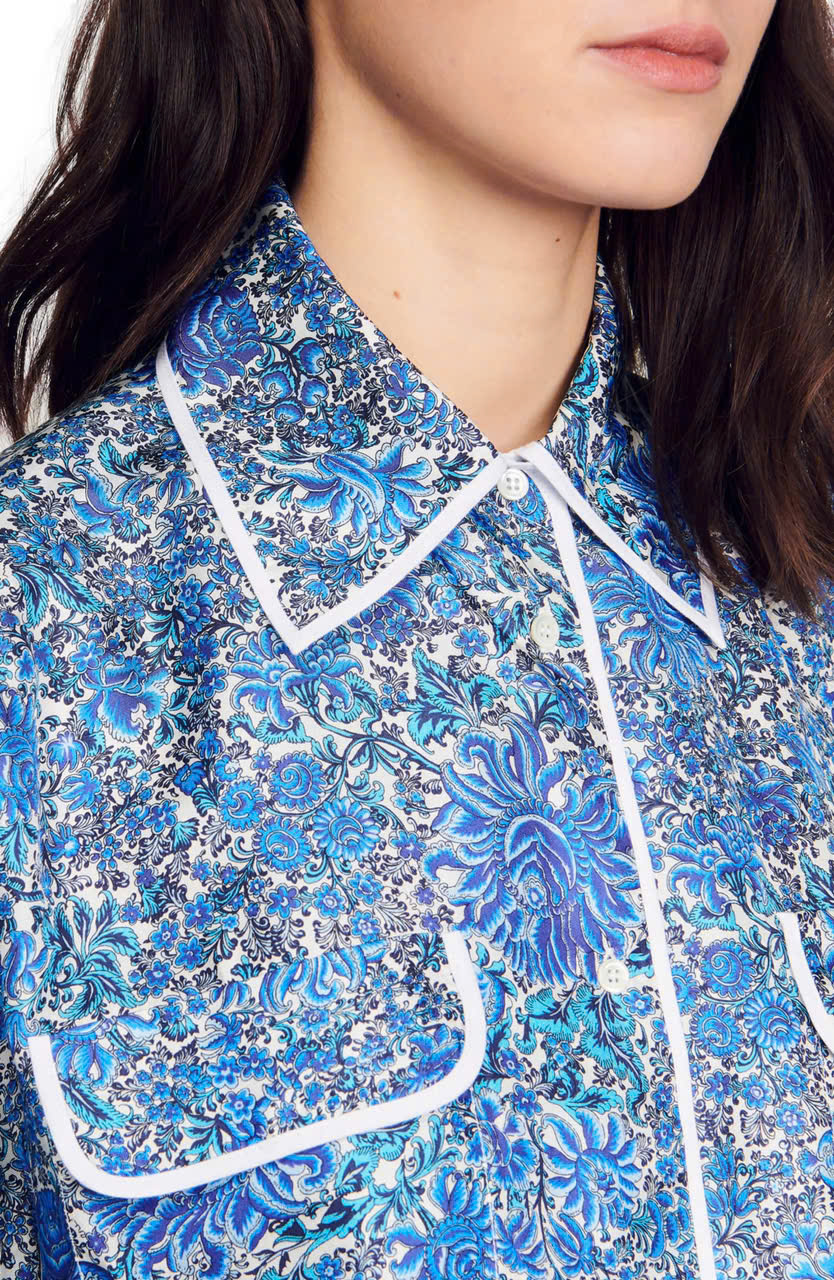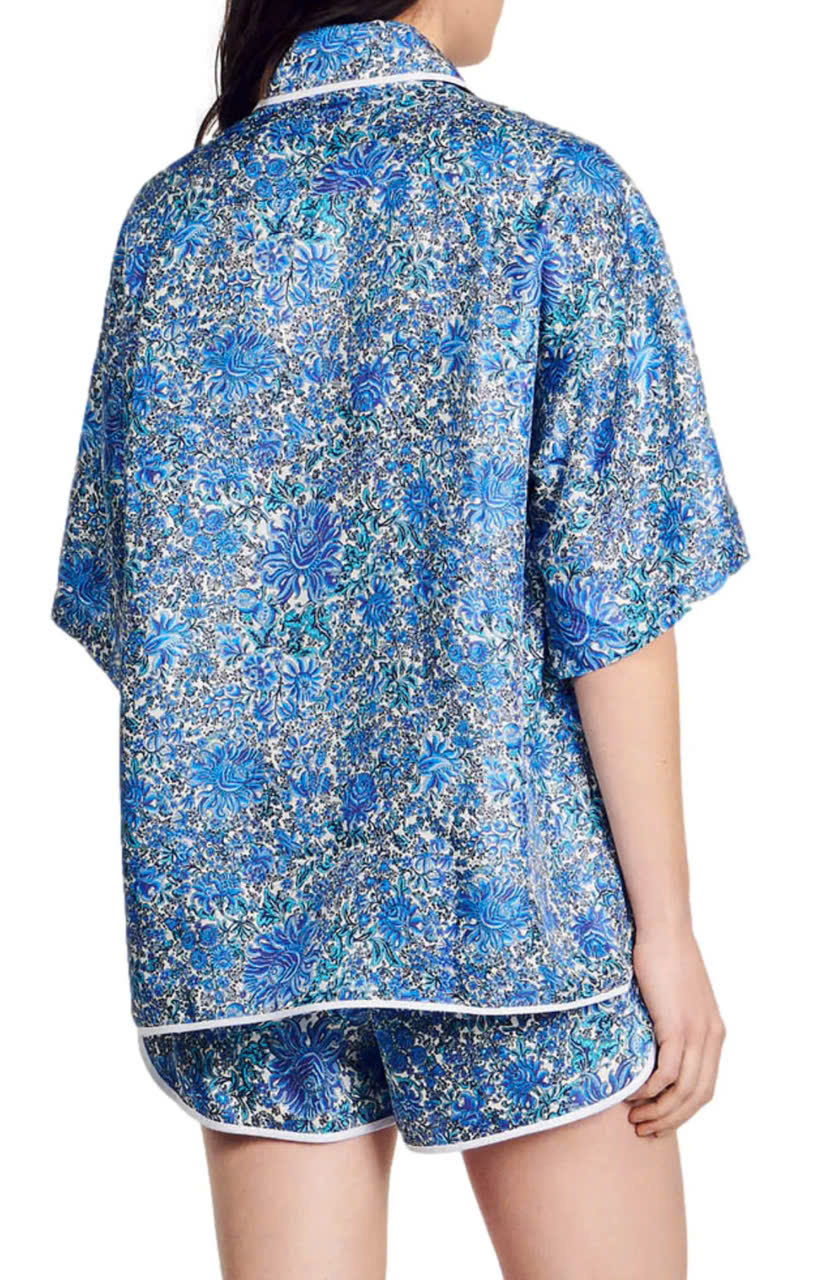 Set lụa Sandro hoa xanh Áo sơ mi + Quần short
