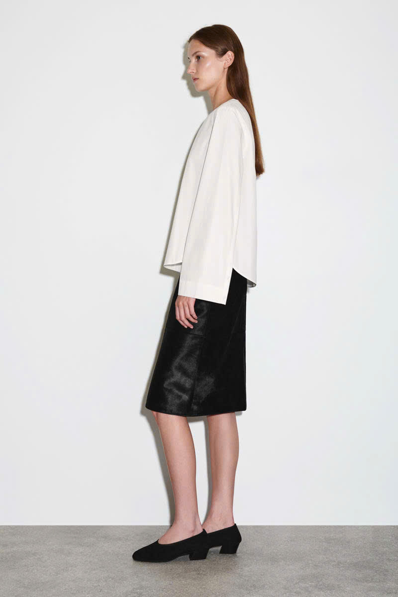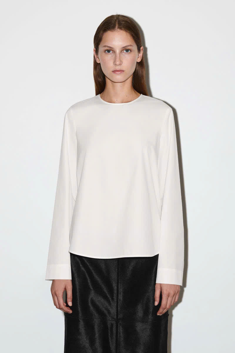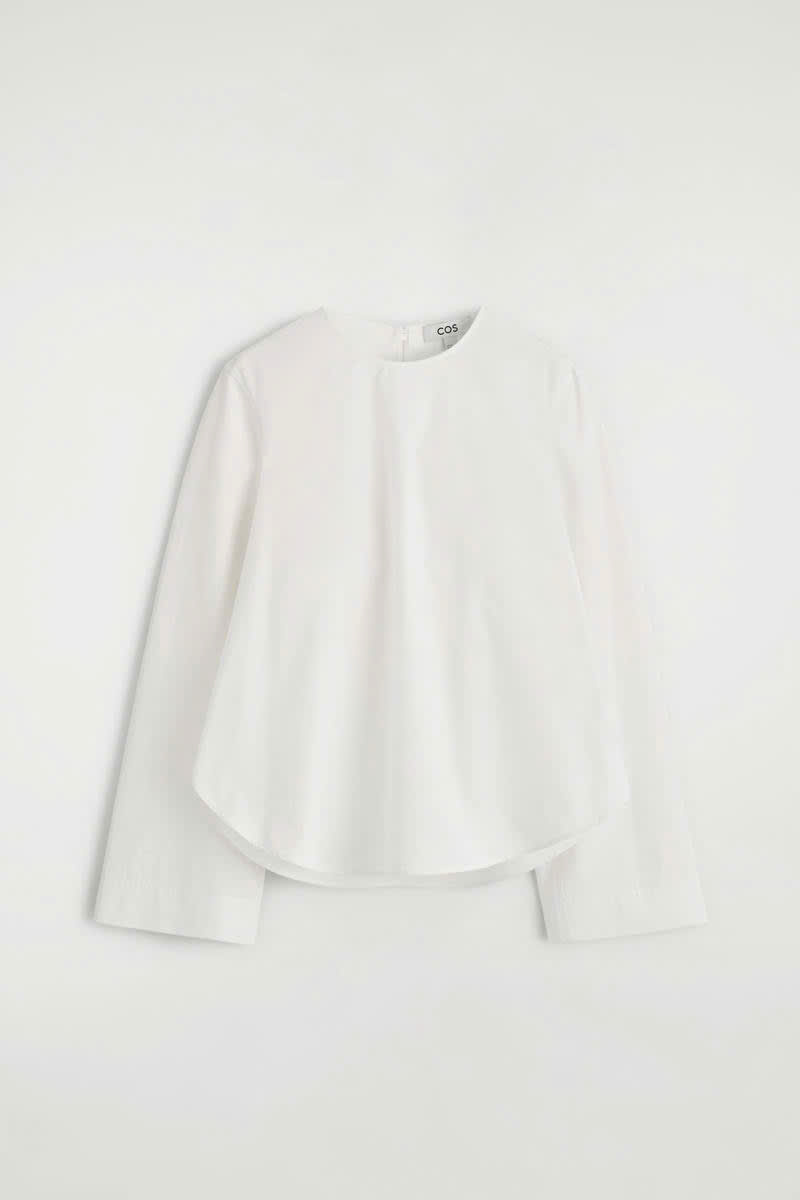 Chiếc áo cánh tinh tế này được may từ chất liệu cotton cao cấp với viền cong và hàng cúc xà cừ cùng tông màu, mang đến vẻ ngoài tinh tế.
