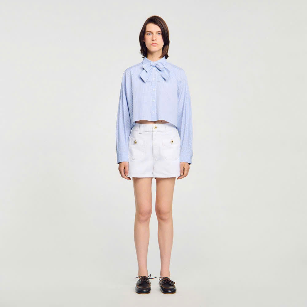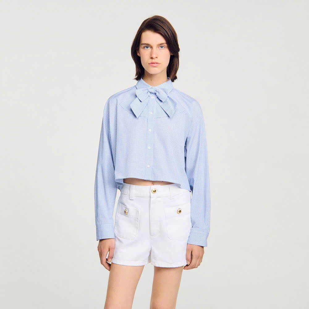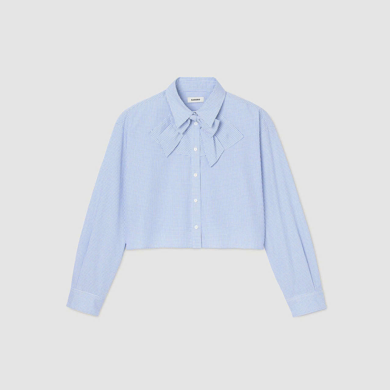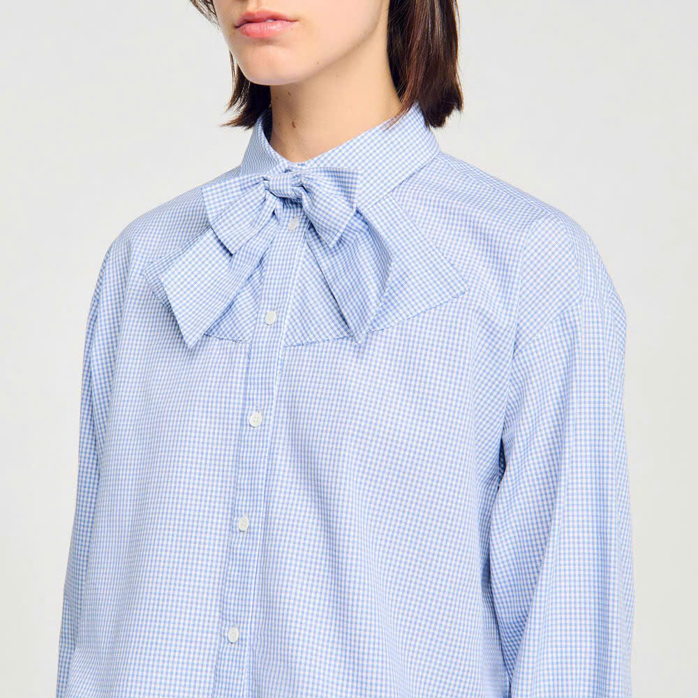 MÔ TẢ •Áo sơ mi caro ngắn tay dài, cổ áo có nơ và cài nút. •Áo sơ mi caro ngắn nữ Sandro •Cổ áo có nơ •Cổ tay áo cài nút và xếp ly •Cài nút •Thiết kế dáng ôm vừa vặn