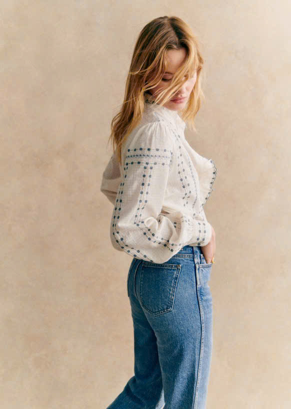 Chất liệu: Linen Áo sơ mi tay dài Cổ cao Phối ren ở vạt áo và cổ áo