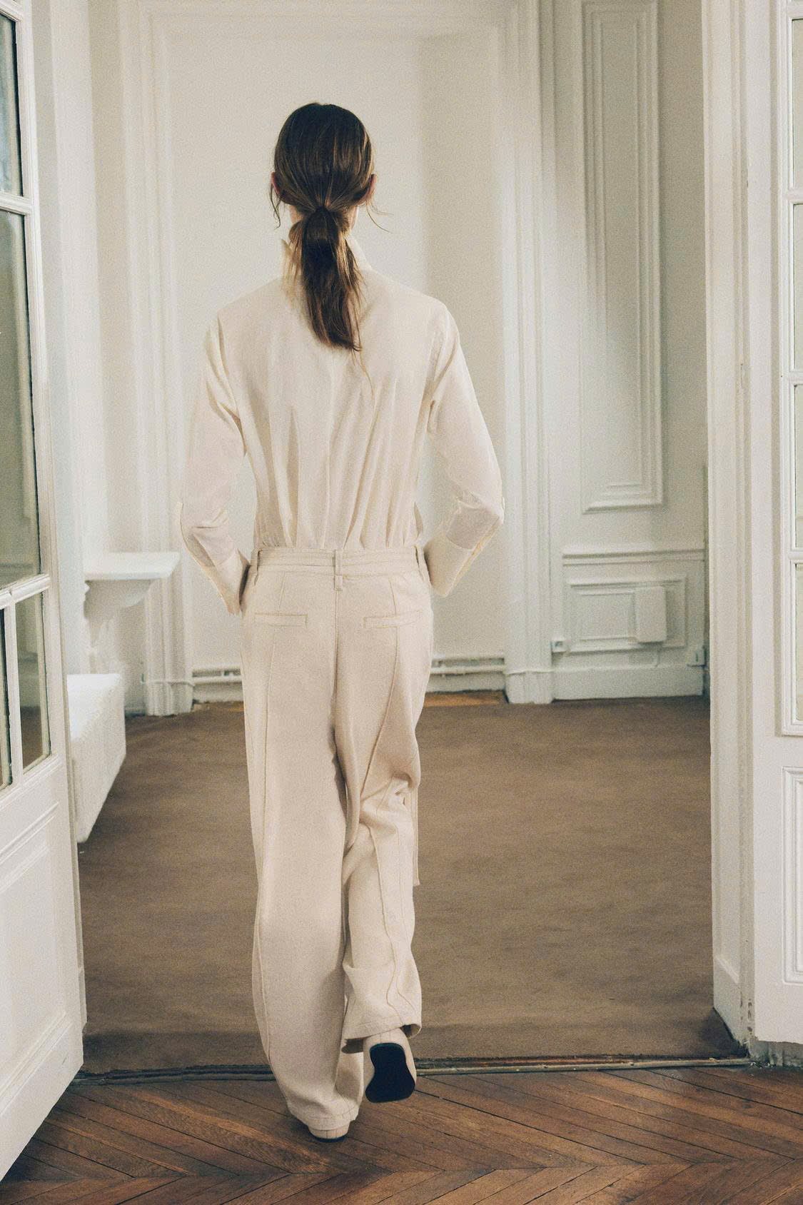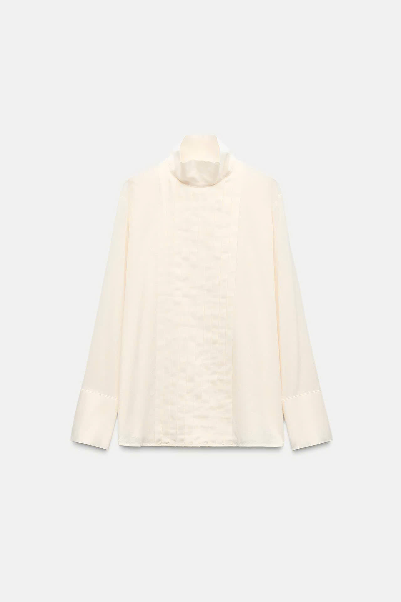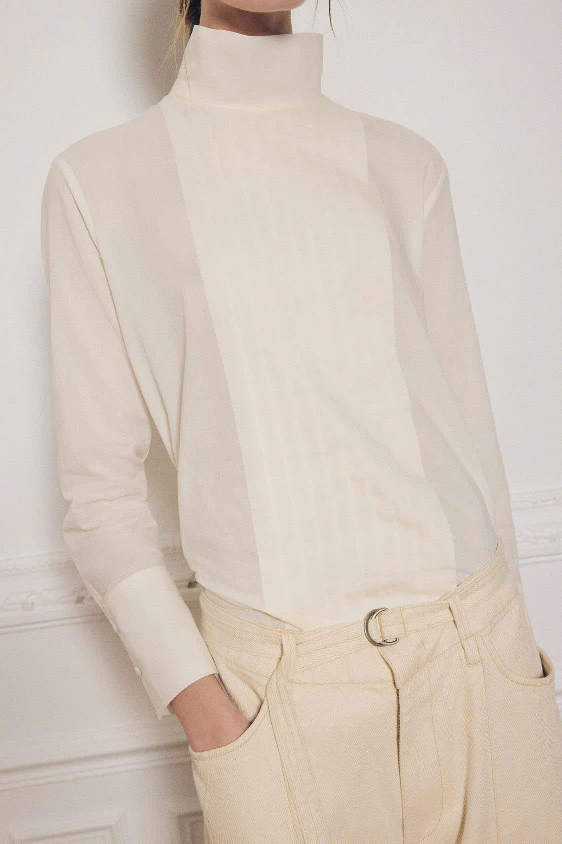 Chất liệu: 100% sợi cotton. Cổ cao, tay dài, cài khuy ở cổ tay áo cùng chất liệu vải và chi tiết xếp ly phía trước. Khóa kéo ẩn phía sau.