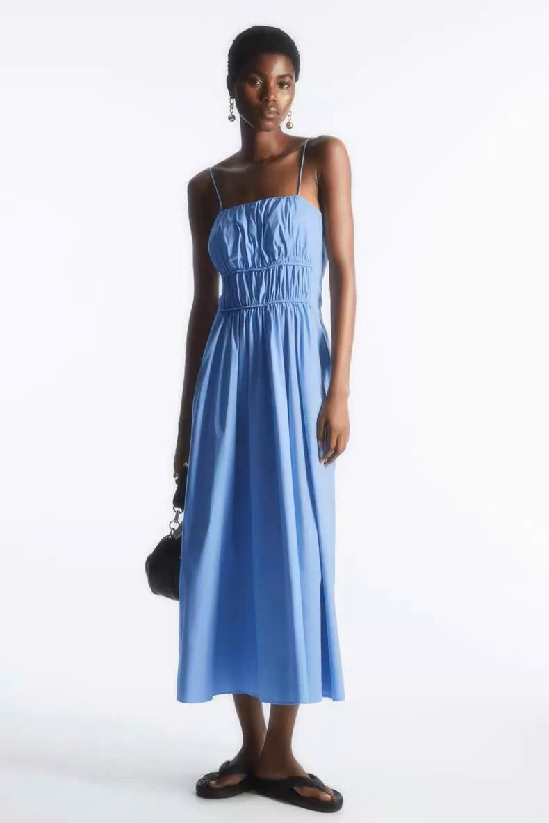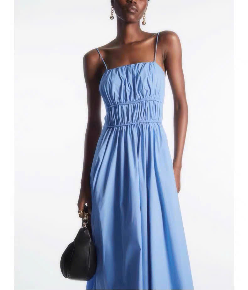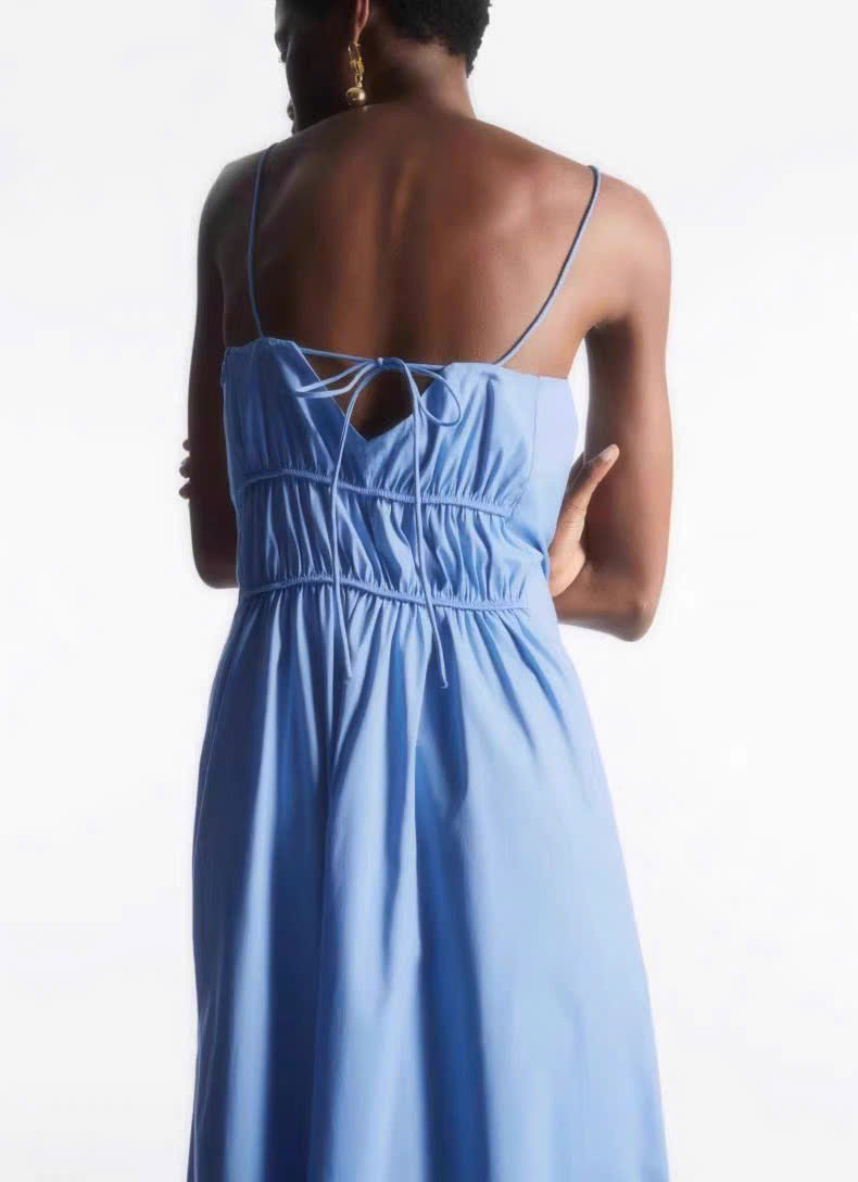 Thân váy có chi tiết nhún (gathering) ở phần ngực và eo, giúp tạo độ phồng và làm nổi bật vòng eo