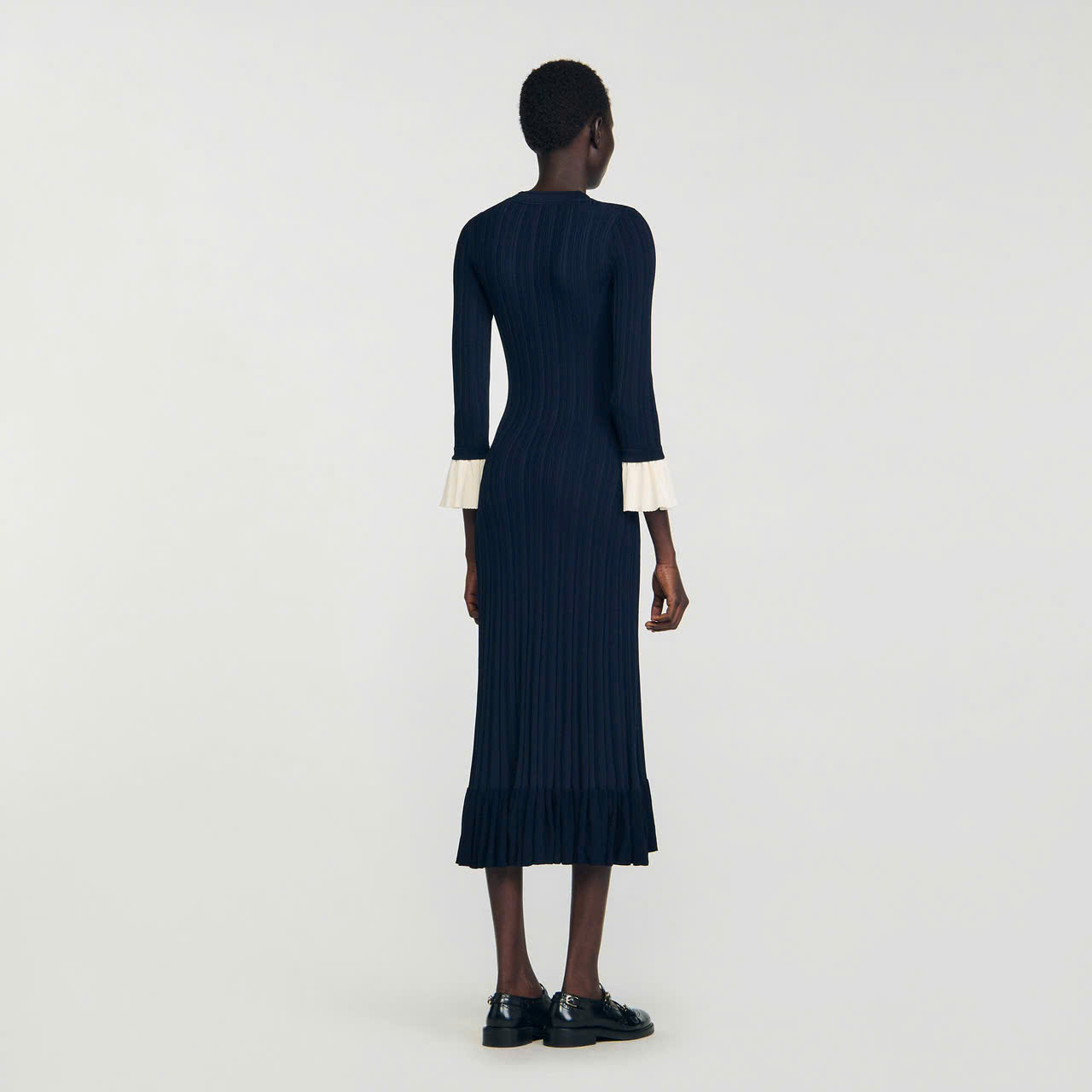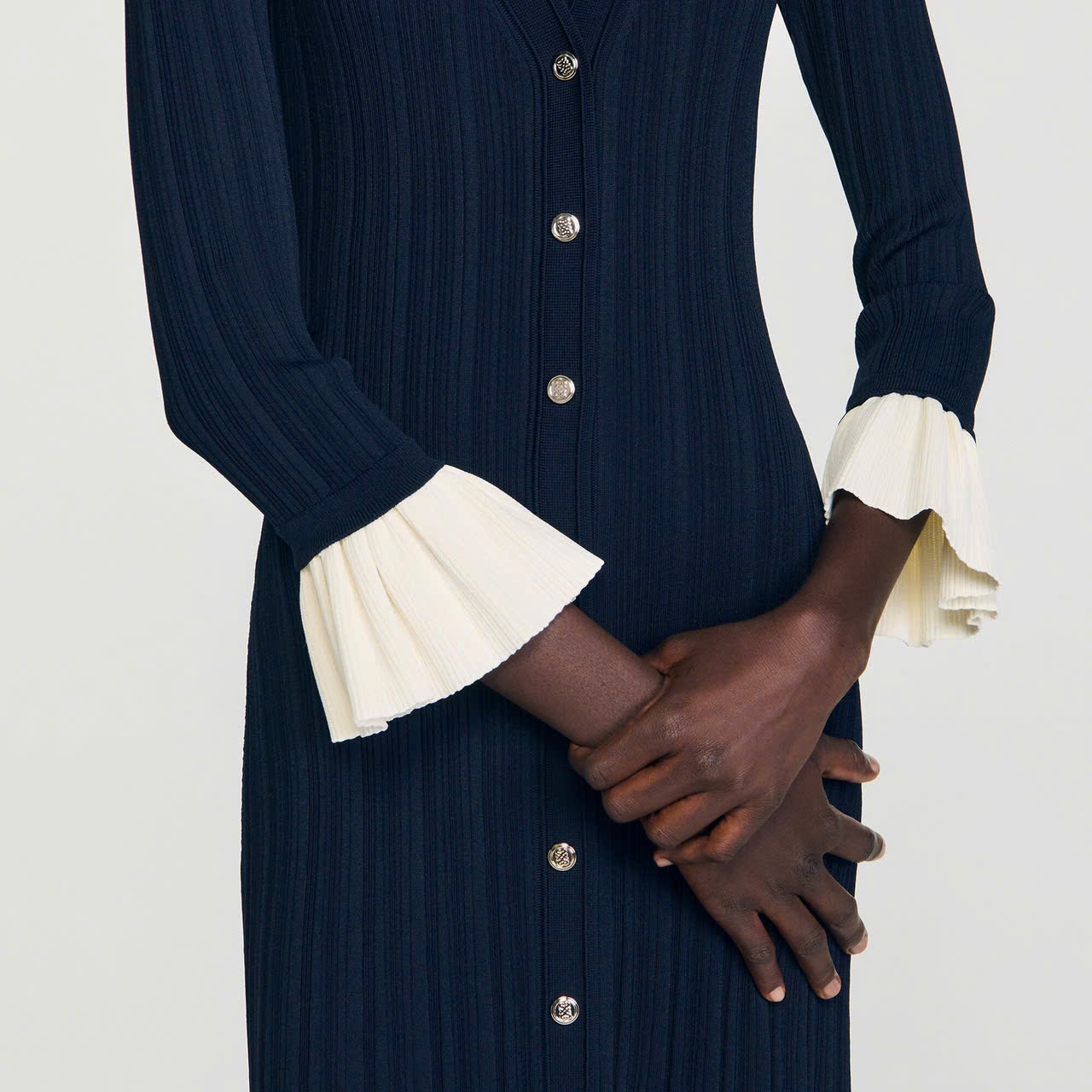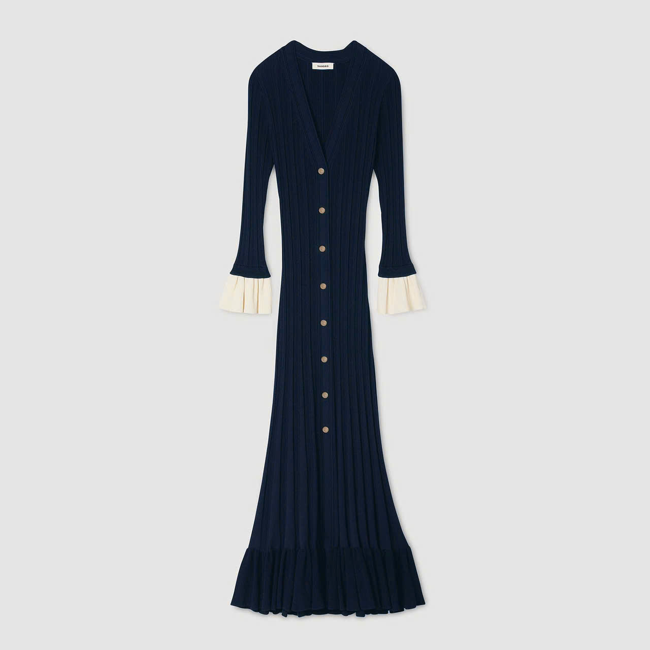 MÔ TẢ Đầm maxi dệt kim cổ chữ V, bèo nhún tương phản ở cuối tay áo, gấu váy nhún bèo và khuy cà