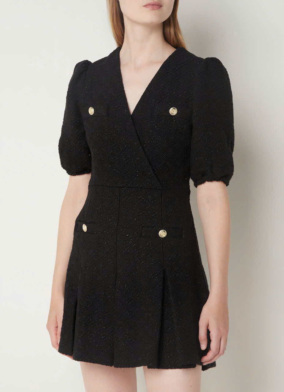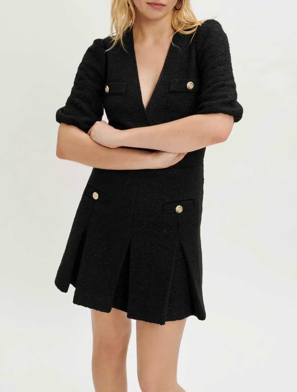 Váy vải tuýt Tay áo phồng ngắn Chi tiết túi giả Vải chính: 34% cotton, 18% polyester, 17% viscose, 15% acrylic, 7% len, 5% polyamide, 4% sợi kim loại Lớp lót túi: 100% cotton