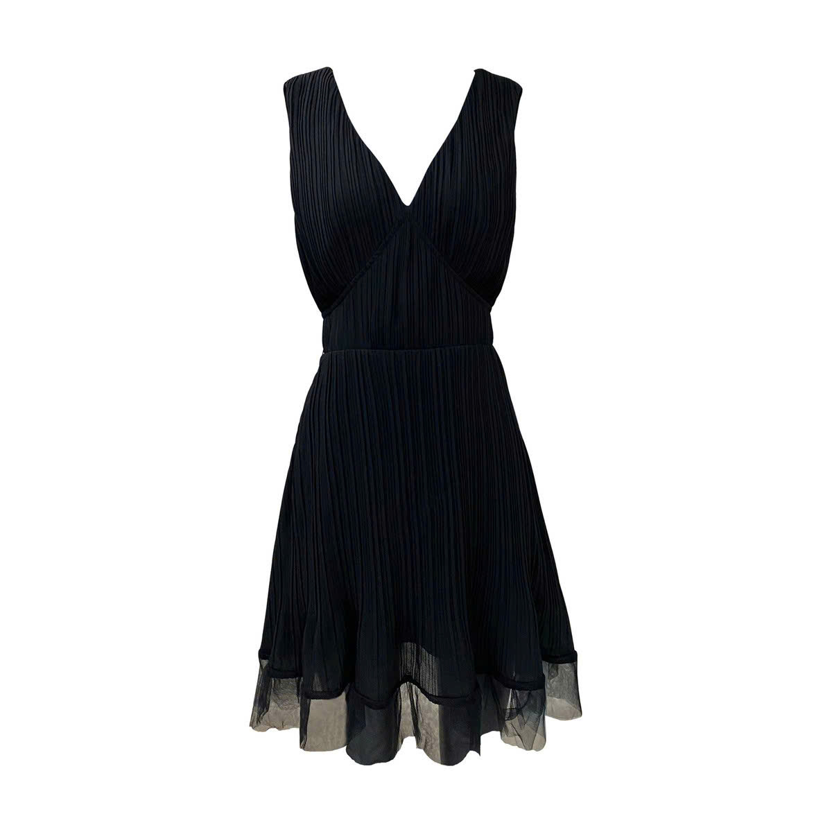 Váy liền dáng chữ A ngắn, có cổ chữ V sâu, không tay, phần eo được nhấn nhẹ bằng dây nhỏ để tôn dáng. Váy có nếp xếp ly dọc từ ngực xuống chân váy, tạo cảm giác thanh mảnh, mềm mại và sang trọng. Mép váy được viền ren hoặc chi tiết voan lượn nhẹ, làm tăng nét nữ tính và tinh tế.