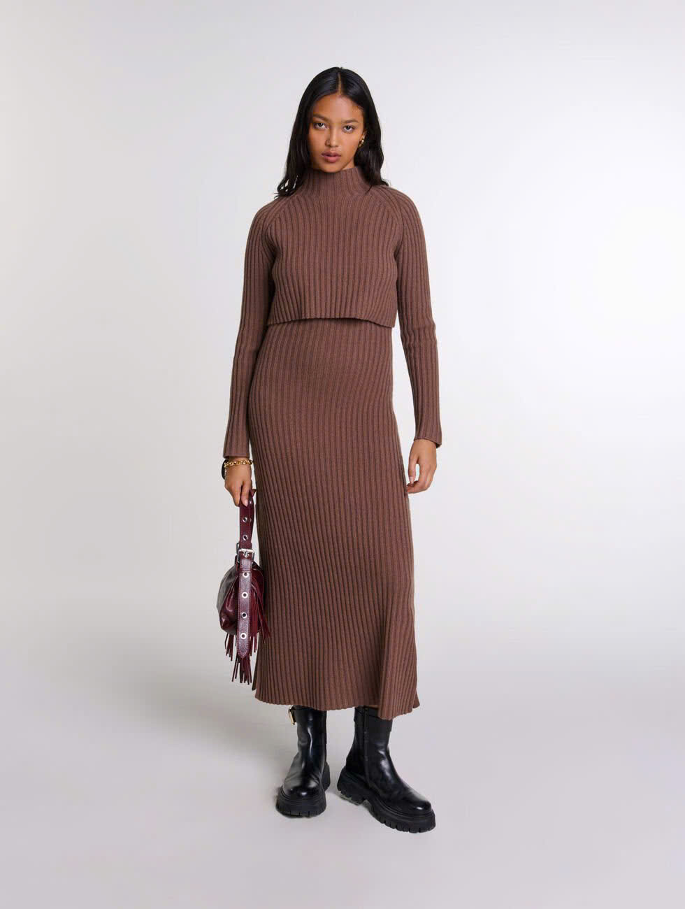 Áo kiểu cổ chữ V, có dây đeo trước và sau Eo ôm Xẻ tà hai bên gấu váy Áo len dài tay cổ cao Thẻ hình cỏ ba lá sau lưng