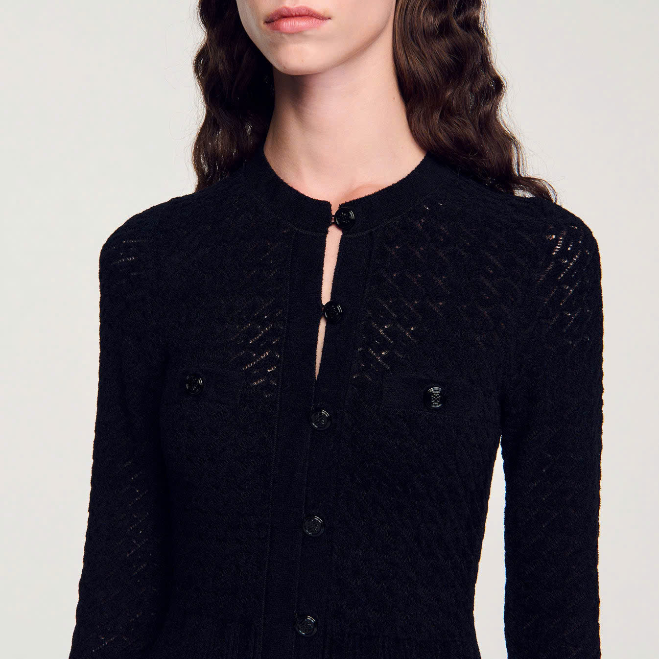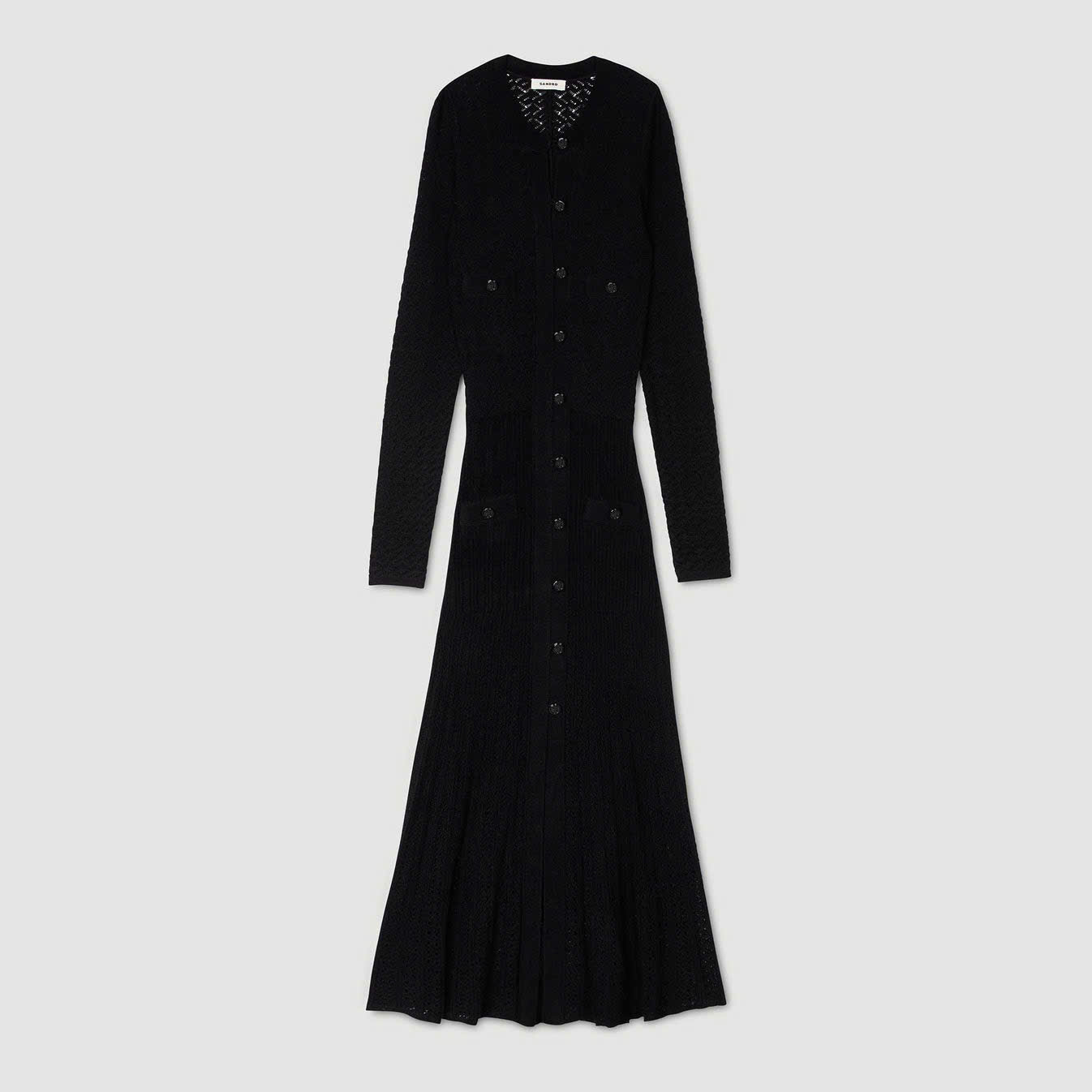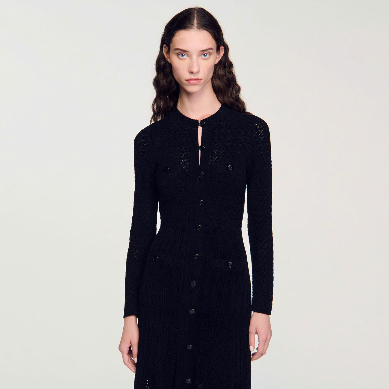 Đầm dài dệt kim hiệu ứng nhung hở vai, cài nút, tay dài và túi viền.