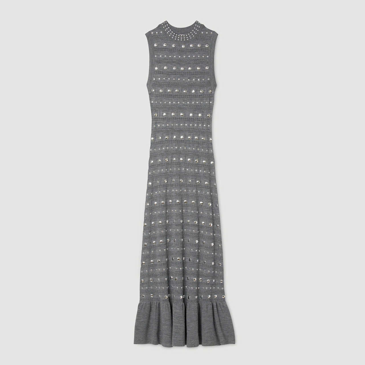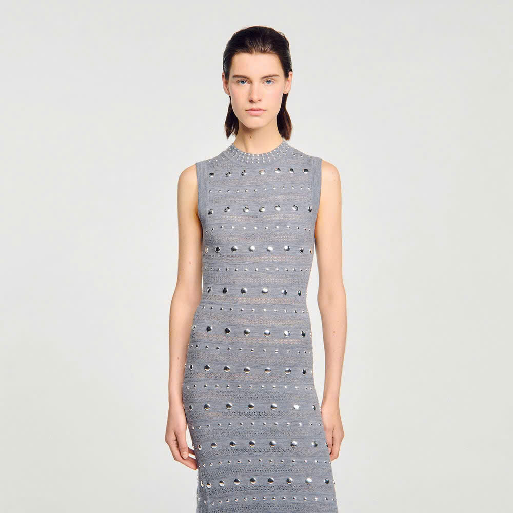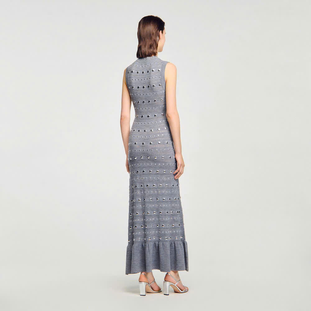 •Đầm maxi dệt kim co giãn Sandro dành cho nữ •Cổ tròn •Không tay •Váy voan mỏng •Viền nhún bèo •Đinh tán kim loại màu bạc •Thiết kế ôm sát