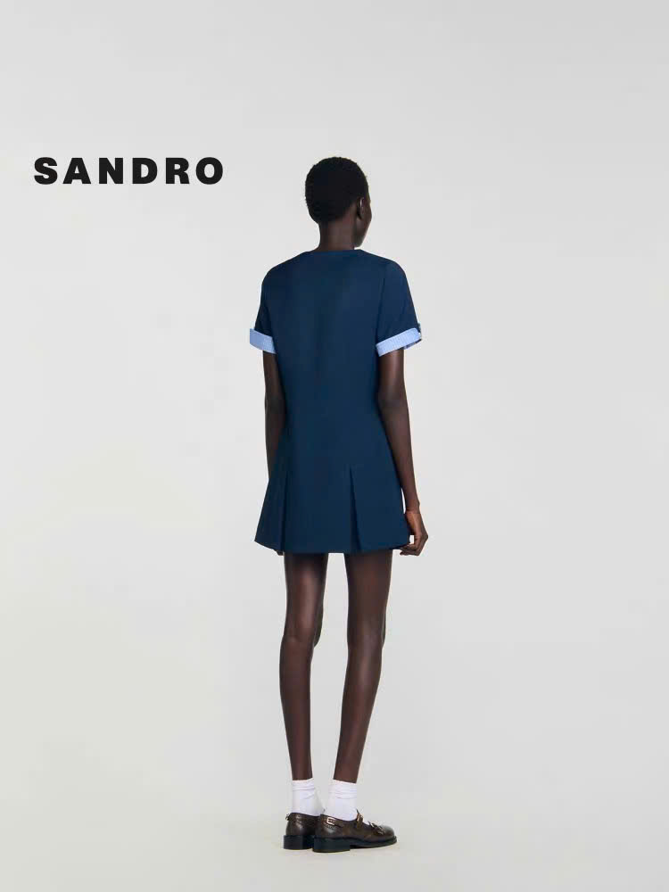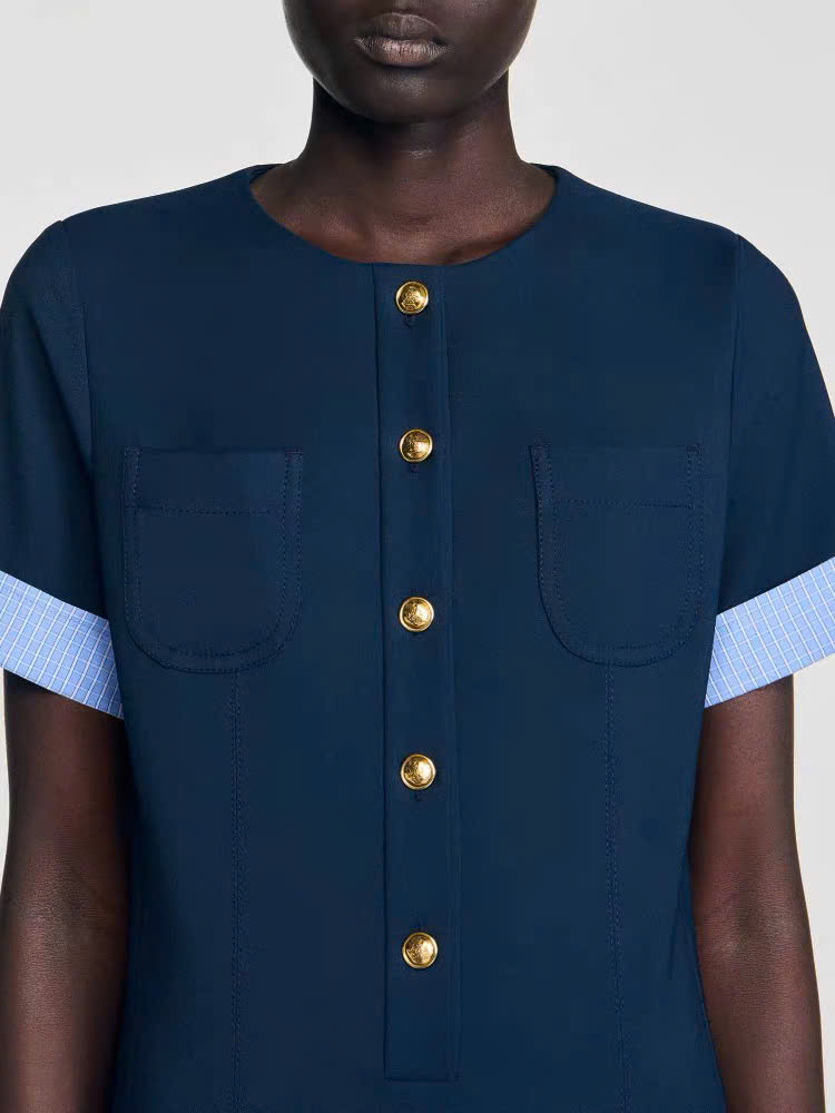-Đầm caro ngắn nữ Sandro -Cổ tròn -Cúc cài -Tay ngắn có miếng chèn màu tương phản -Túi vá có đường khâu nổi ở ngực