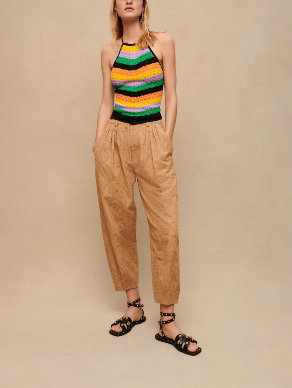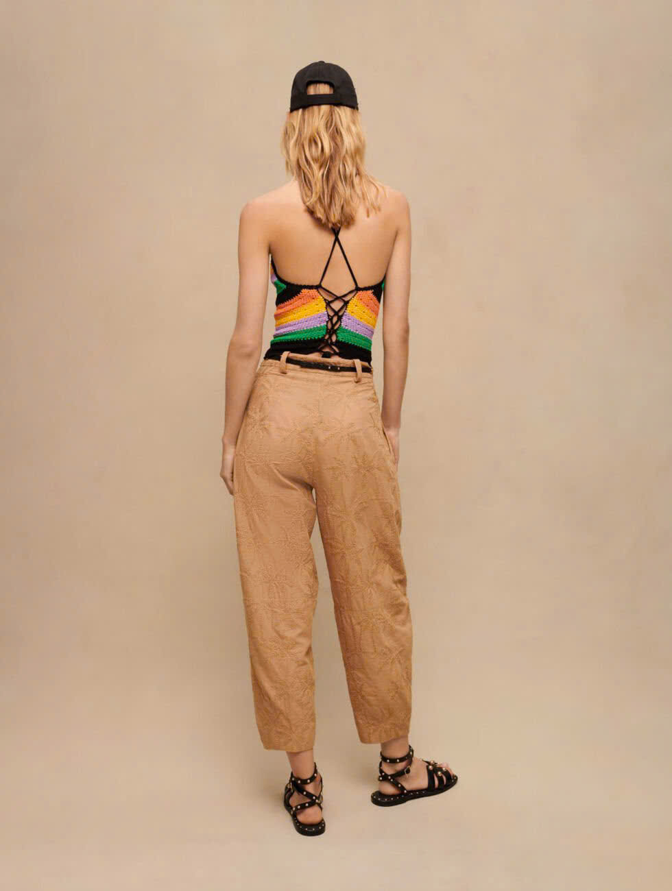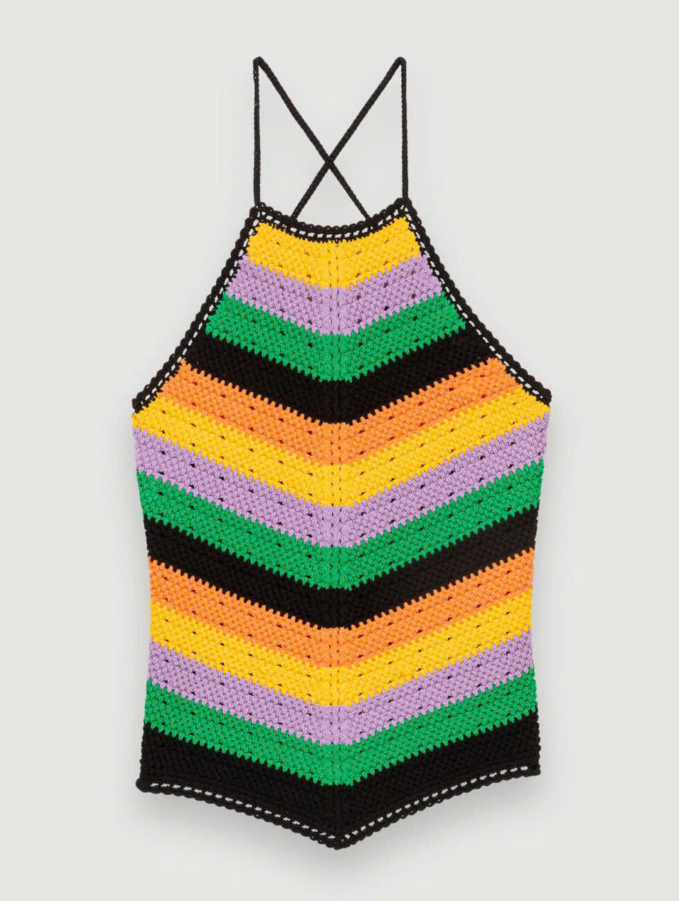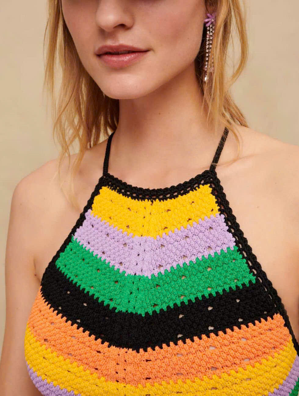 Chất liệu: viscose Chiếc áo crop top hở cổ đan móc này có họa tiết sọc nhiều màu, hứa hẹn sẽ làm nổi bật mọi trang phục mùa hè của bạn. Phần dây buộc tinh tế khoe khéo phần lưng áo.